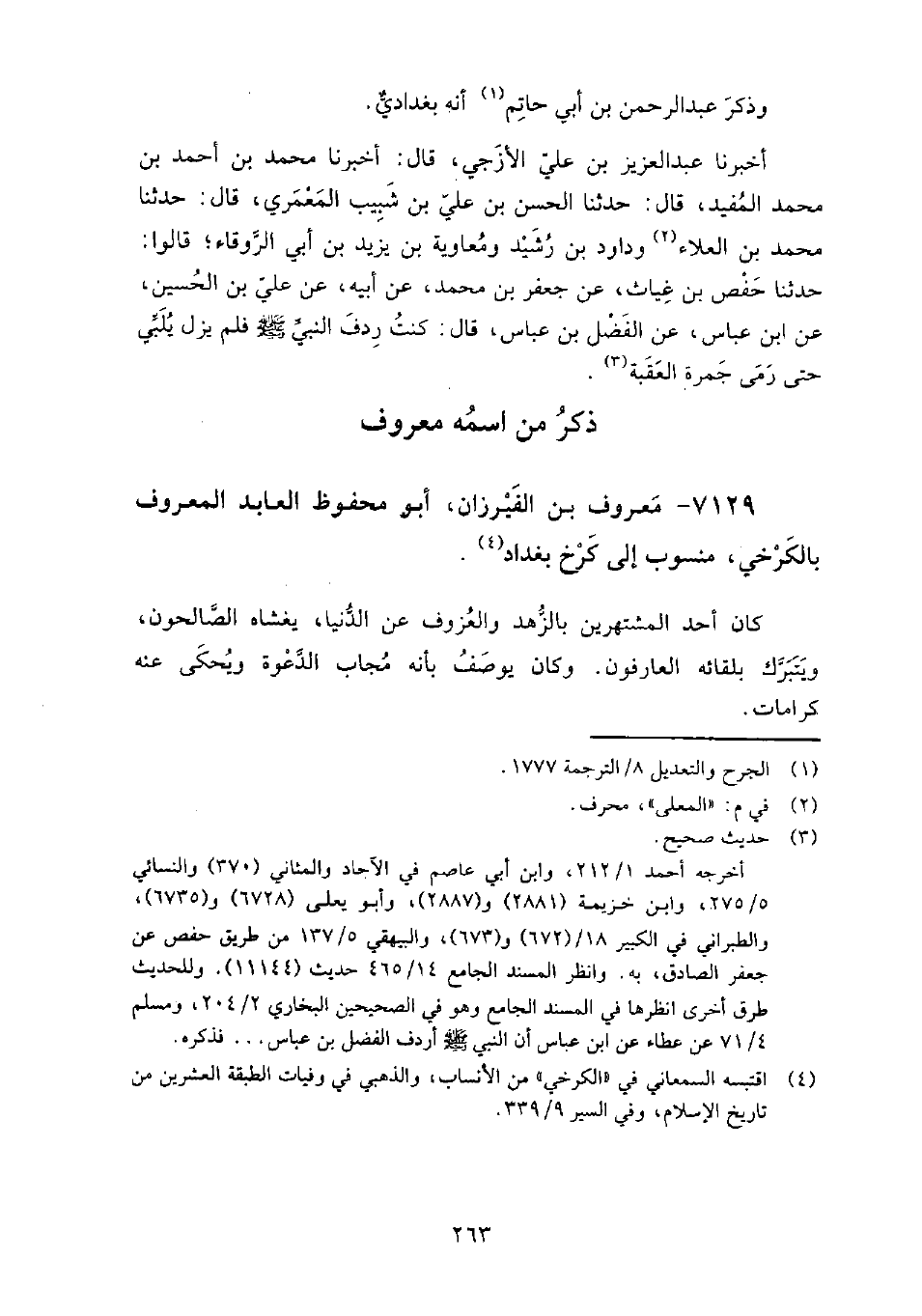 7129 - معروف بن الفيرزان، أَبُو محفوظ العابد المعروف بالكرخي منسوب إلى كرخ بغداد، كان أحد المشتهرين بالزهد والعزوف عن الدنيا، يغشاه الصالحون، ويتبرك بلقائه العارفون، وكان يوصف بأنه مجاب الدعوة، ويحكى عنه كرامات.