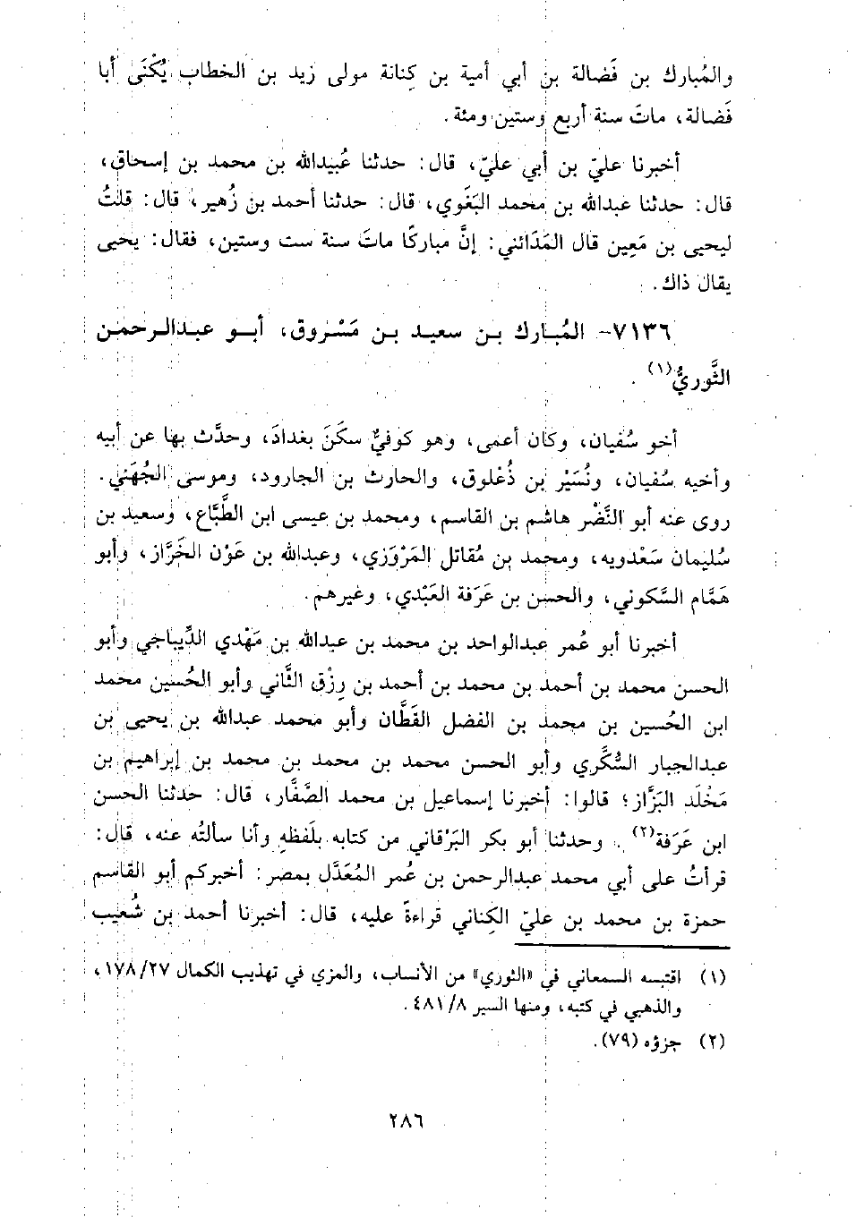 7136 - المبارك بن سعيد بن مسروق، أَبُو عَبْد الرَّحْمَن الثوري أخو سفيان، وكان أعمى، وهو كوفي سكن بغداد، وحدث بها عن: أبيه، وأخيه سفيان، ونسير بن ذعلوق، والحارث بن الجارود، وموسى الجهني.