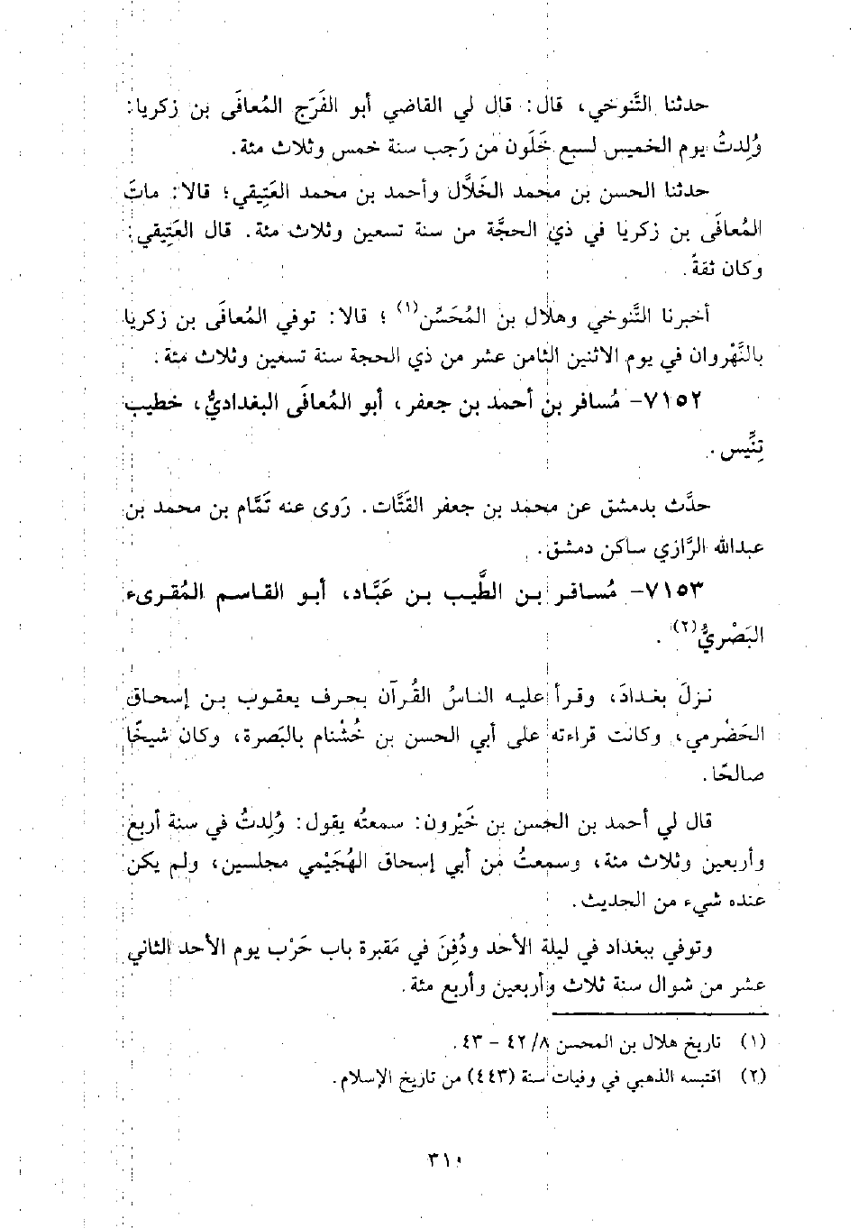 7152 - مسافر بن أَحْمَد بن جَعْفَر، أَبُو المعافى البَغْدَادِيُّ، خطيب تنيس حَدَّثَ بدمشق عن: مُحَمَّد بن جَعْفَر القتات.