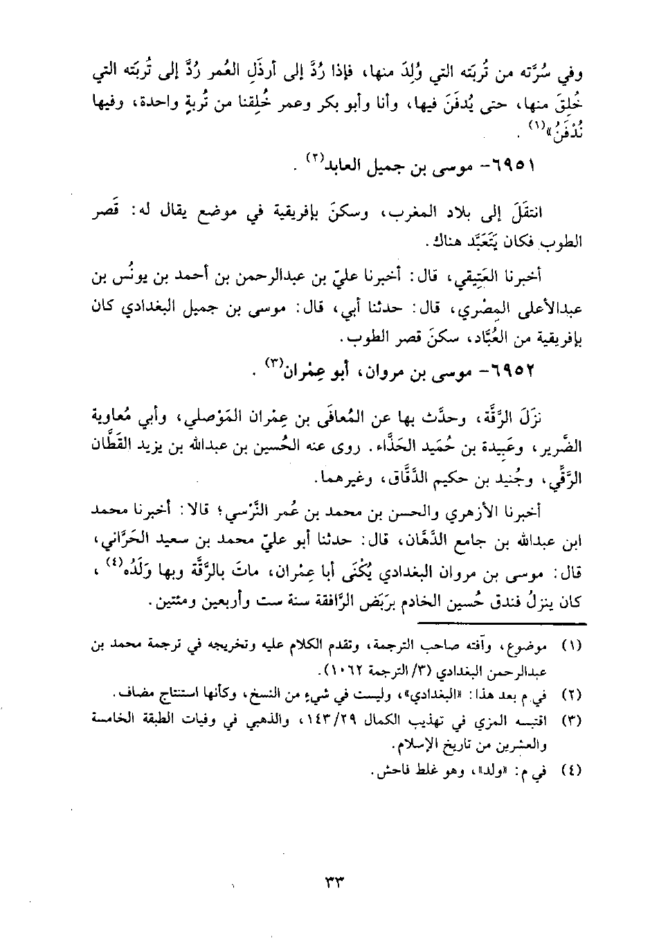 6951 - موسى بن جميل العابد انتقل إلى بلاد المغرب، وسكن بإفريقية في موضع يقال له: قصر الطوب فكان يتعبد هناك.