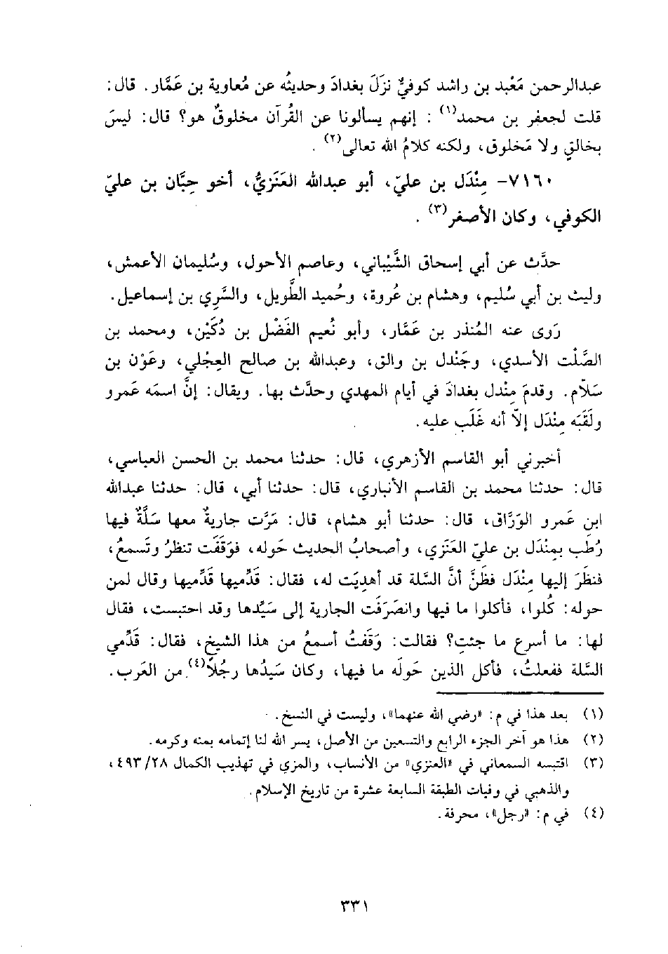 7160 - مندل بن علي، أَبُو عبد الله العنزي أخو حبان بن علي الكوفي، وكان الأصغر حدث عن: أبي إسحاق الشيباني، وعاصم الأحول، وسليمان الأعمش، وليث بن أبي سليم، وهشام بن عروة، وحميد الطويل، والسري بن إسماعيل.