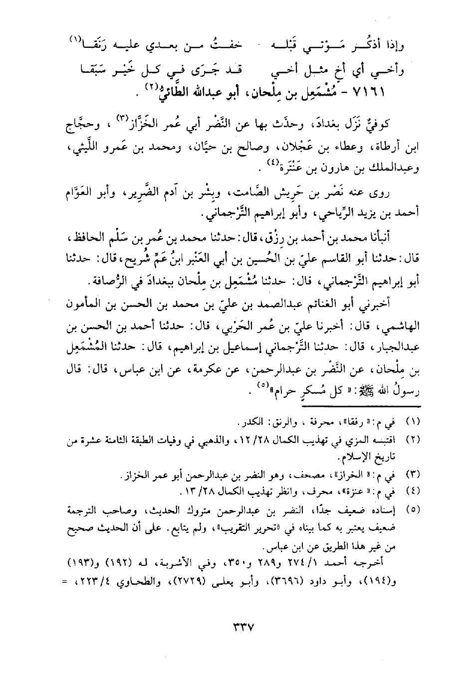 (4489) -[15: 337] أَخْبَرَنِي أَبُو الْغَنَائِمِ عَبْدُ الصَّمَدِ بْنُ عَلِيِّ بْنِ مُحَمَّدِ بْنِ الْحَسَنِ بْنِ الْمَأْمُونِ الْهَاشِمِيُّ، قَالَ: أَخْبَرَنَا عَلِيُّ بْنُ عُمَرَ الْحَرْبِيُّ، قَالَ: حَدَّثَنَا أَحْمَدُ بْنُ الْحَسَنِ بْنِ عَبْدِ الْجَبَّارِ، قَالَ: حَدَّثَنَا التَّرْجُمَانِيُّ إِسْمَاعِيلُ بْنُ إِبْرَاهِيمَ، قَالَ: حَدَّثَنَا الْمُشْمَعِلُّ بْنُ مِلْحَانَ، عَنِ النَّضْرِ بْنِ عَبْدِ الرَّحْمَنِ، عَنْ عِكْرِمَةَ، عَنِ ابْنِ عَبَّاسٍ، قَالَ: قَالَ رَسُولُ اللَّهِ صَلَّى اللَّهُ عَلَيْهِ وَسَلَّمَ: " كُلُّ مُسْكِرٍ حَرَامٌ " أَخْبَرَنَا الصيمري، قَالَ: قرأنا عَلَى الحُسَيْن بن هَارُون الضَّبِّيّ عن أَبِي العَبَّاس أَحْمَد بن مُحَمَّد بن سَعِيد، قَالَ: المشمعل بن ملحان الطائي كوفي، نزل بَغْدَاد أَخْبَرَنَا الجوهري، قَالَ: أَخْبَرَنَا مُحَمَّد بن العَبَّاس، قَالَ: حَدَّثَنَا مُحَمَّد بن الْقَاسِم الكوكبي، قَالَ: حَدَّثَنَا إِبْرَاهِيم بن عَبْد الله بن الجُنَيْد، قَالَ: سألت يَحْيَى بن معين عن المشمعل بن ملحان الطائي، فَقَالَ: كَانَ ههنا ما أرى كَانَ بِهِ بأس.