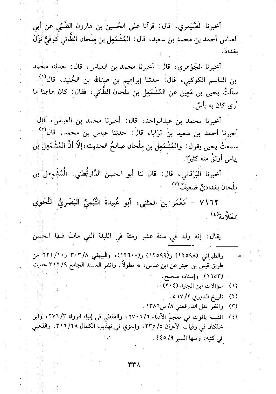 7162 - معمر بن المثنى، أَبُو عبيدة التيمي البصري النحوي العلامة يقال: إنه ولد في سنة عشر ومائة في الليلة التي مات فيها الحسن البصري، وقال الجاحظ: لم يكن في الأرض خارجي ولا جامعي أعلم بجميع العلوم منه، وقدم بغداد في أيام هارون الرشيد، وقرئ عليه بها أشياء من كتبه، وأسند الحديث عن هشام بن عروة وغيره.