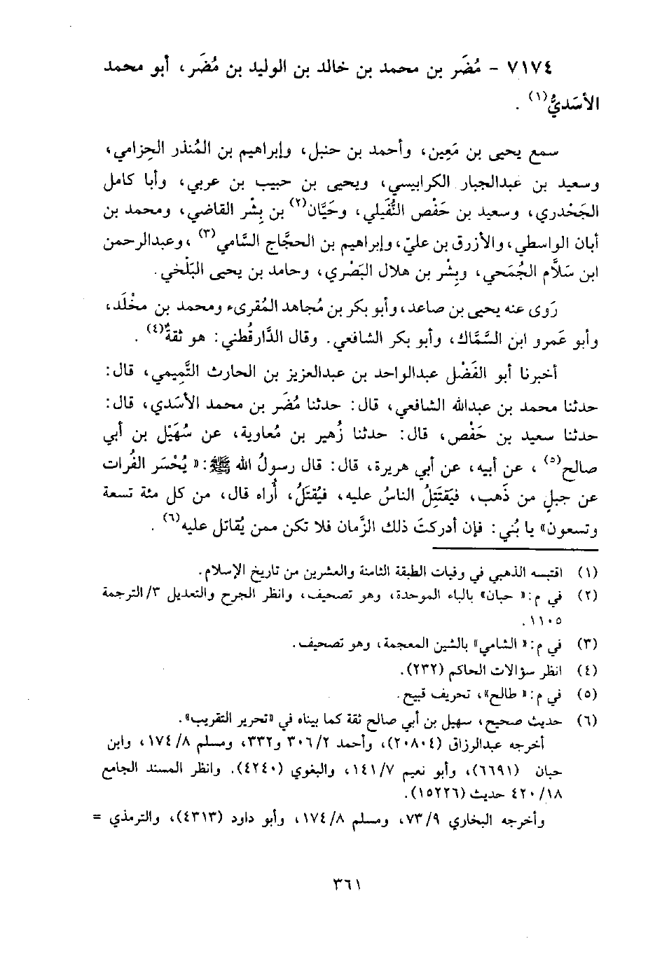7174 - مضر بن مُحَمَّد بن خَالِد بن الوليد بن مضر أَبُو مُحَمَّد الأَسَدِيّ سَمِعَ: يَحْيَى بن معين، وَأَحْمَد بن حَنْبَل، وَإِبْرَاهِيم بن المنذر الحزامي، وَسَعِيد بن عَبْد الجبار الكرابيسي، وَيَحْيَى بن حبيب بن عربي، وأبا كامل الجحدري، وَسَعِيد بن حفص النفيلي، وحيان بن بِشْر القاضي، وَمُحَمَّد بن أبان الوَاسِطِيّ، والأزرق بن عَليّ، وَإِبْرَاهِيم بن الحجاج السامي، وَعَبْد الرَّحْمَن بن سلام الجمحي، وَبِشْر بن هلال البَصْرِيّ، وحامد بن يَحْيَى البَلْخِيّ.