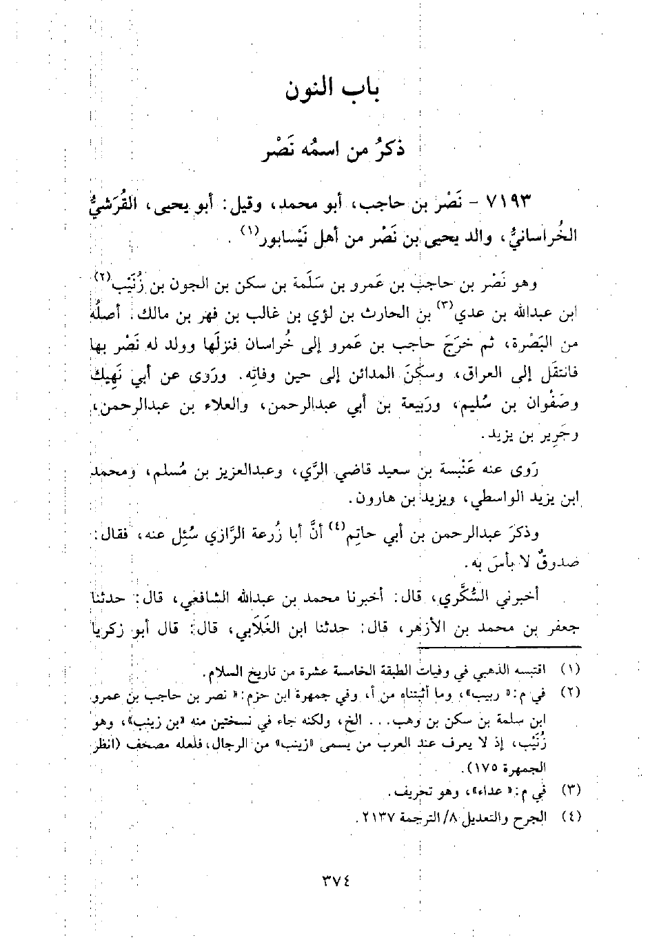 7193 - نصر بن حاجب أَبُو مُحَمَّد وقيل: أَبُو يحيى القرشي الخراساني، والد يحيى بن نصر من أهل نيسابور،