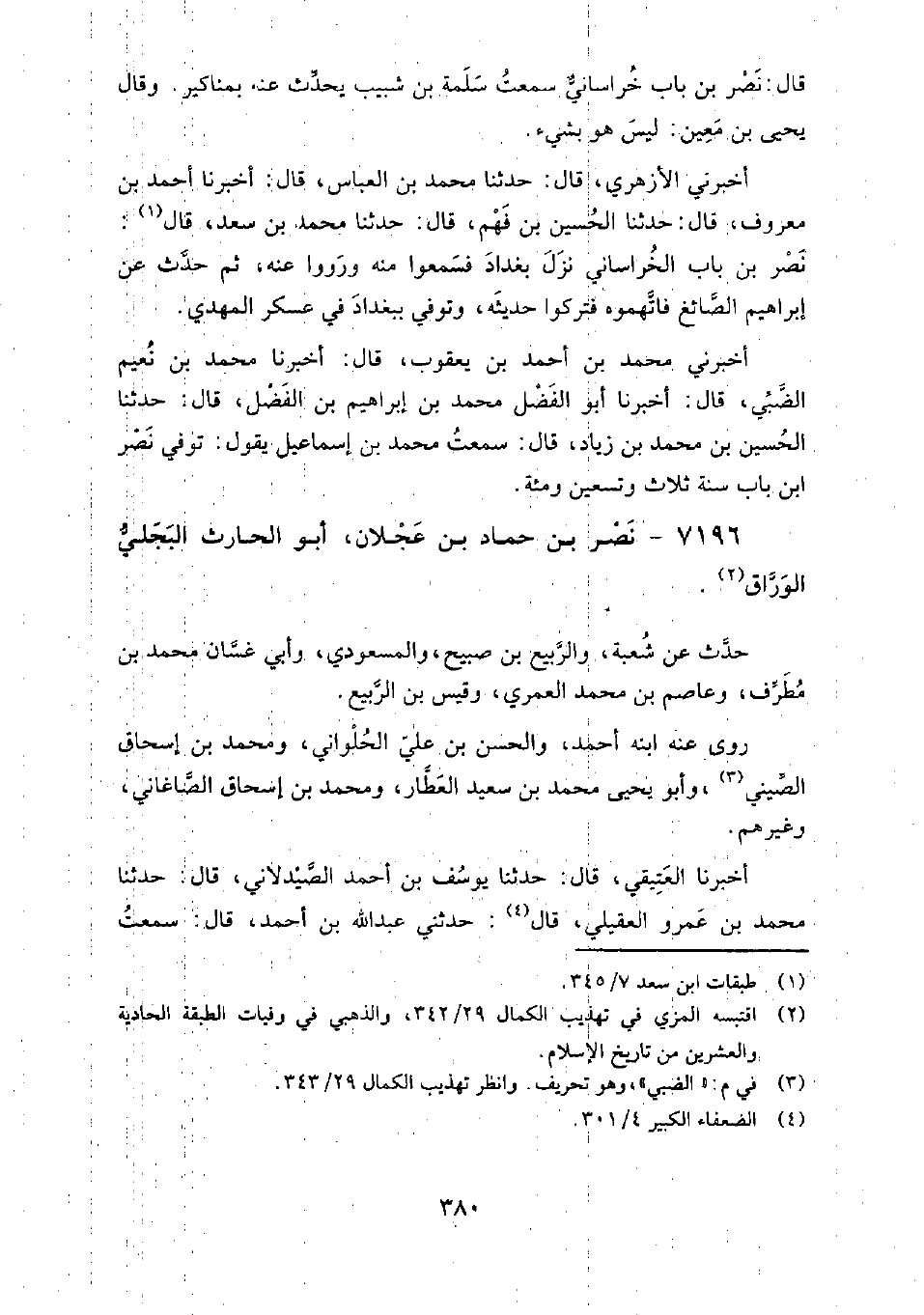 7196 - نصر بن حَمَّاد بن عجلان أَبُو الحارث البَجَلِيّ الوَرَّاق حدث عن: شُعْبَة، والربيع بن صبيح والمسعودي، وَأَبِي غسان مُحَمَّد بن مُطَرِّف، وعاصم بن مُحَمَّد العمري، وقيس بن الربيع.