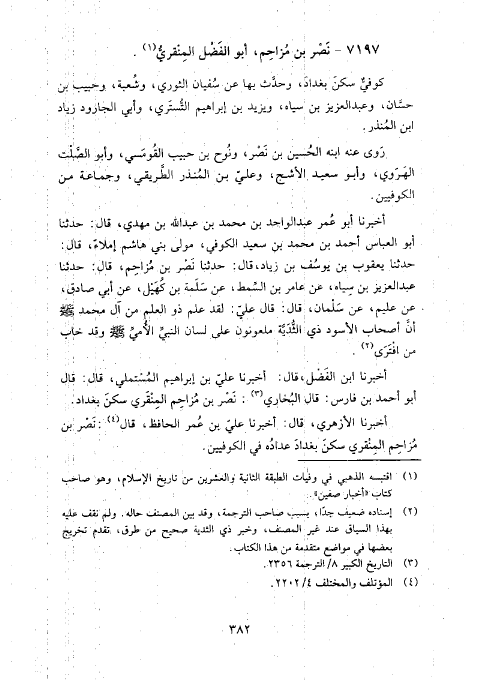 7197 - نصر بن مُزَاحِم أَبُو الفضل المنقري كوفي، سكن بَغْدَاد، وحدث بها عن: سُفْيَان الثوري، وَشُعْبَة، وحبيب بن حسان، وَعَبْد العزيز بن سياه، ويزيد بن إِبْرَاهِيم التُّسْتَرِي، وَأَبِي الجارود زياد بن المنذر.