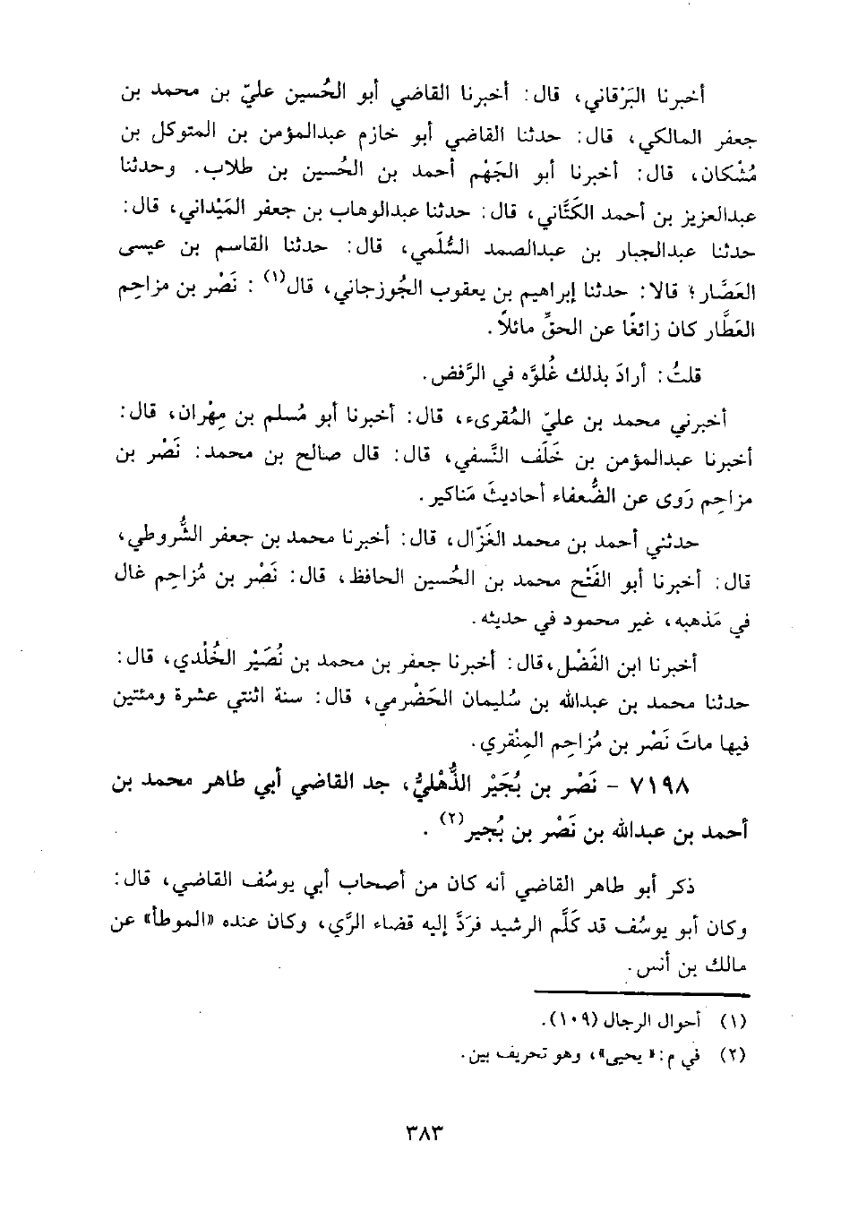 7198 - نصر بن بجير الذهلي، جد القاضي أبي طاهر مُحَمَّد بن أَحْمَد بن عبد الله بن نصر بن بجير ذكر أَبُو طاهر القاضي أنه كان من أصحاب أبي يوسف القاضي، قال: وكان أَبُو يوسف قد كلم الرشيد، فرد إليه قضاء الري، وكان عنده الموطأ عن مالك بن أنس.