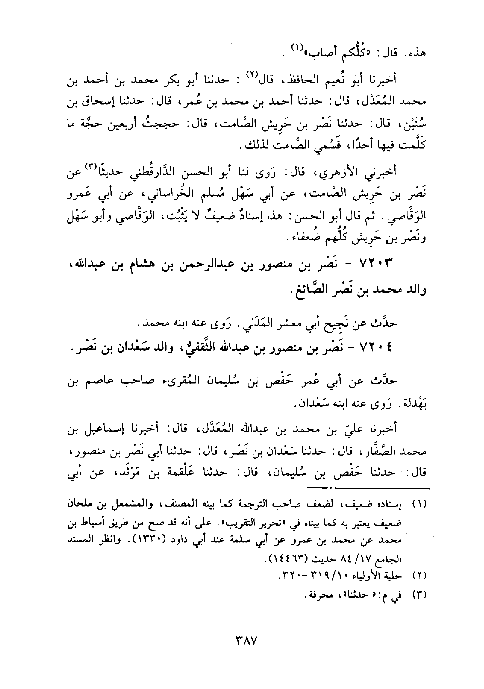7203 - نصر بن منصور بن عَبْد الرَّحْمَن بن هشام بن عبد الله والد مُحَمَّد بن نصر الصائغ حدث يثبت الوقاصي عن نجيح أبي معشر المدني.