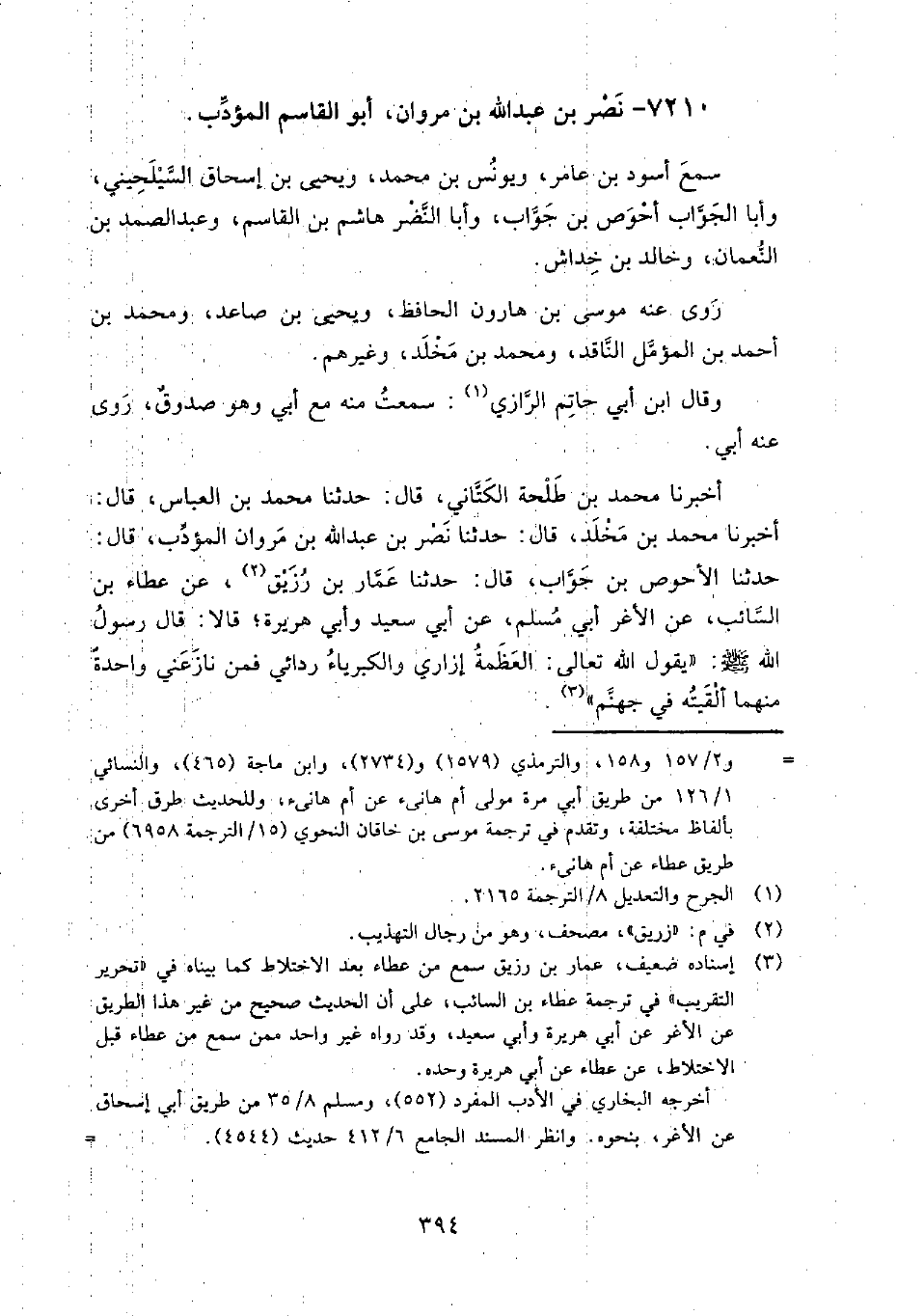 7210 - نصر بن عبد الله بن مَرْوَان أَبُو القاسم المؤدب سمع: أسود بن عامر، ويونس بن مُحَمَّد، ويحيى بن إسحاق السيلحيني، وأبا الجواب أحوص بن جواب، وأبا النضر هاشم بن القاسم، وعبد الصمد بن النعمان، وخالد بن خداش.