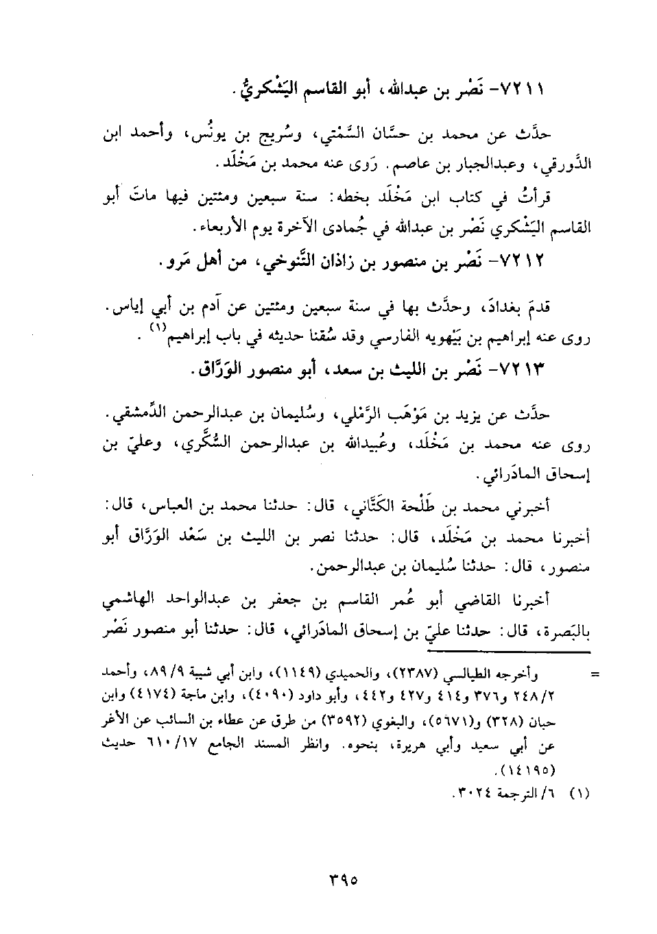 7212 - نصر بن منصور بن زاذان التنوخي من أهل مرو، قدم بغداد، وحدث بها في سنة سبع ومائتين عن: آدم بن إياس، روى عنه: إبراهيم بن بهويه الفارسي، وقد سقنا حديثه في باب إبراهيم.