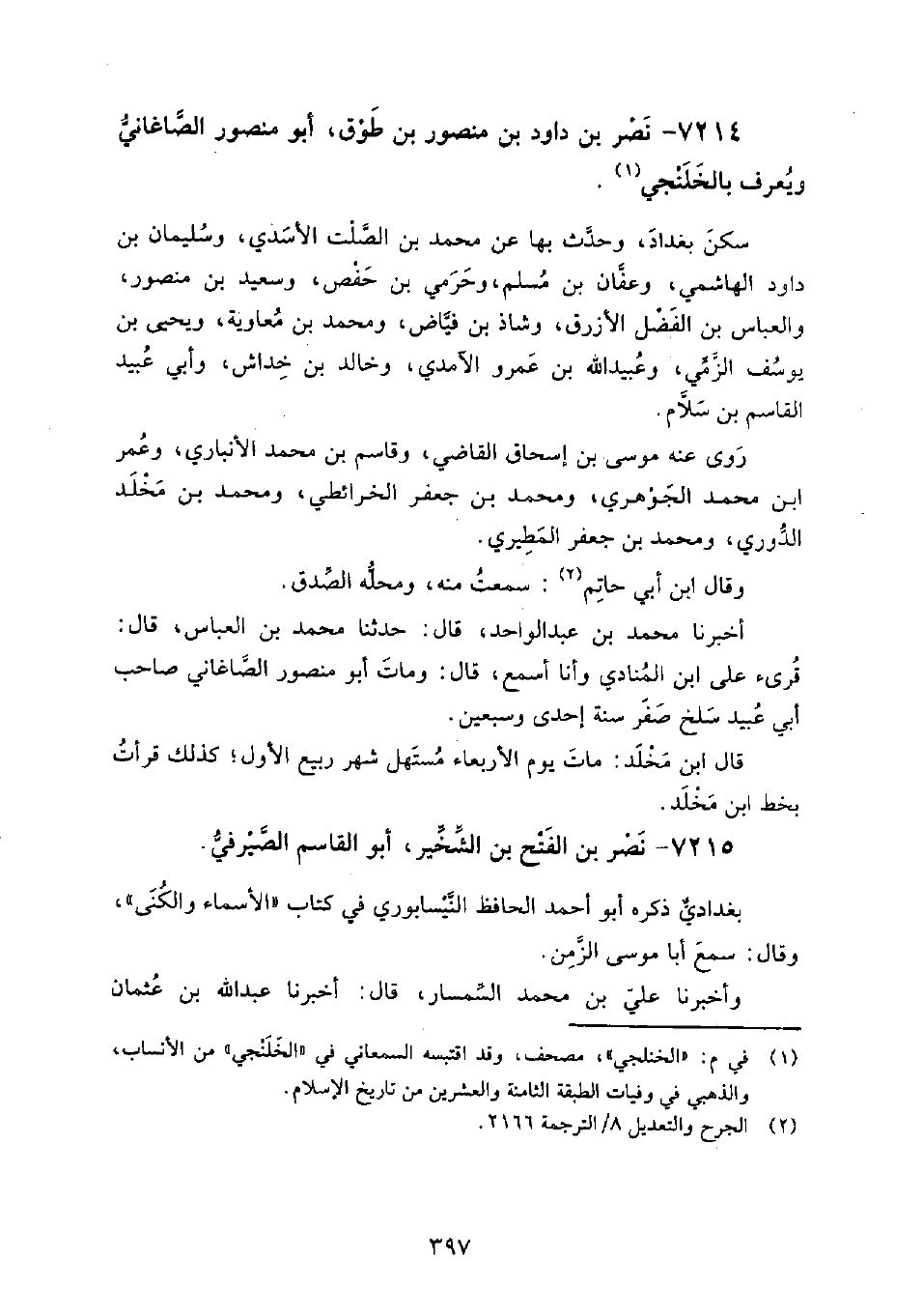 7214 - نصر بن داود بن منصور بن طوق أَبُو منصور الصاغاني ويعرف بالخلنجي سكن بغداد، وحدث بها عن: مُحَمَّد بن الصلت الأسدي، وسليمان بن داود الهاشمي، وعفان بن مسلم، وحرمي بن حفص، وسعيد بن منصور، والعباس بن الفضل الأزرق، وشاذ بن فياض، وَمُحَمَّد بن معاوية، ويحيى بن يوسف الزمي، وعبيد الله بن عمرو الآمدي، وخالد بن خداش، وأبي عبيد القاسم بن سلام.
