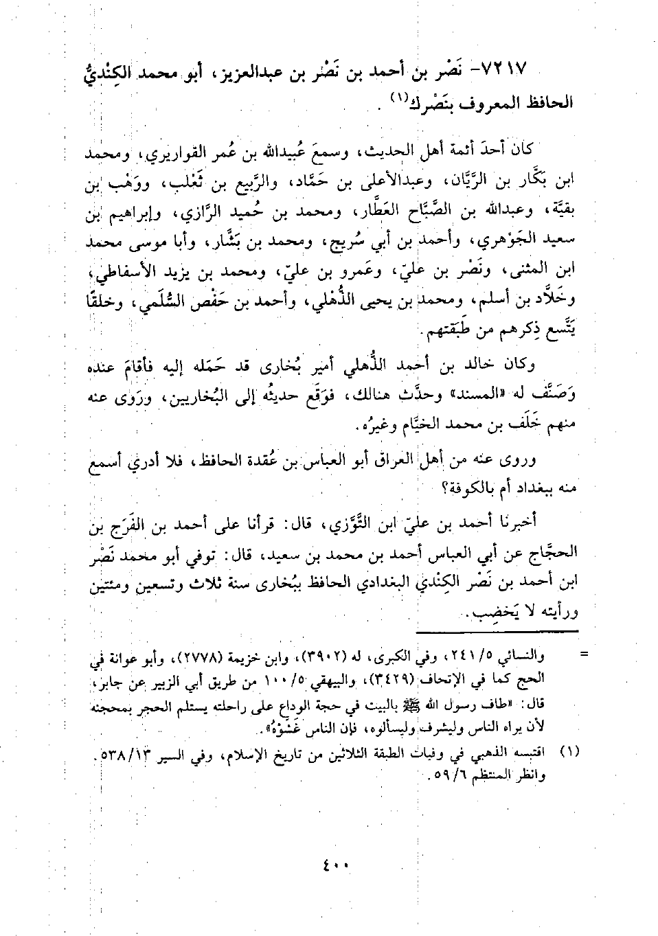 7217 - نصر بن أَحْمَد بن نصر بن عبد العزيز أَبُو مُحَمَّد الكندي الحافظ المعروف بنصرك كان أحد أئمة أهل الحديث، وسمع: عبيد الله بن عمرو القواريري، وَمُحَمَّد بن بكار بن الريان، وعبد الأعلى بن حماد، والربيع بن ثعلب، ووهب بن بقية، وعبد الله بن الصباح العطار، وَمُحَمَّد بن حميد الرازي، وإبراهيم بن سعيد الجوهري، وأحمد بن أبي سريج، وَمُحَمَّد بن بشار، وأبا موسى مُحَمَّد بن المثنى، ونصر بن علي، وعمرو بن علي، وَمُحَمَّد بن يزيد الأسفاطي، وخلاد بن أسلم، وَمُحَمَّد بن يحيى الذهلي، وأحمد بن حفص السلمي، وخلقا يتسع ذكرهم من طبقتهم.