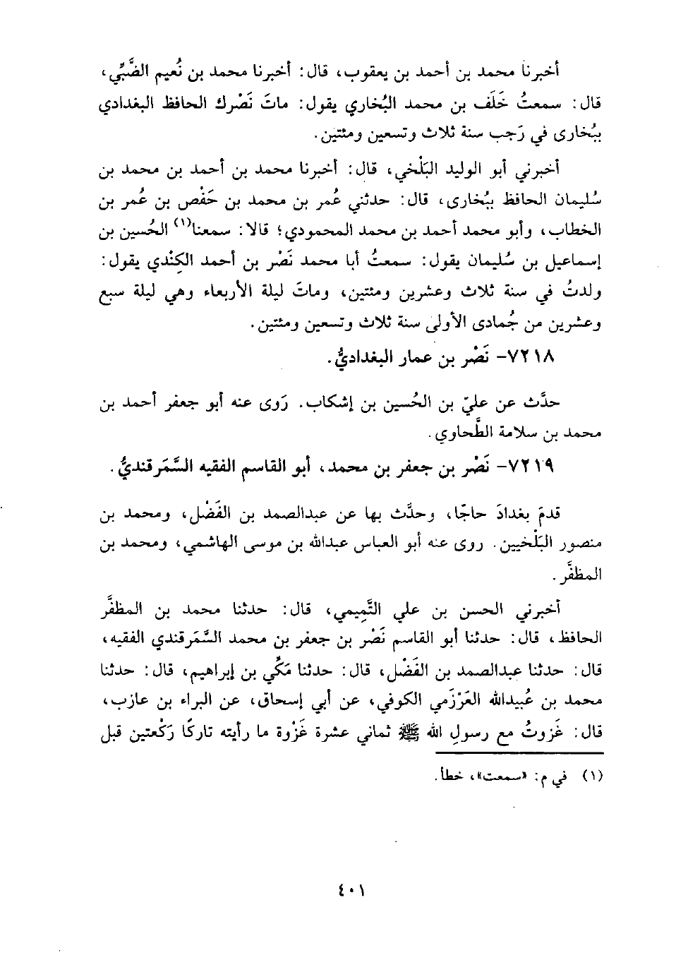 7218 - نصر بن عمار البغدادي حدث عن: علي بن الحسين بن إشكاب.