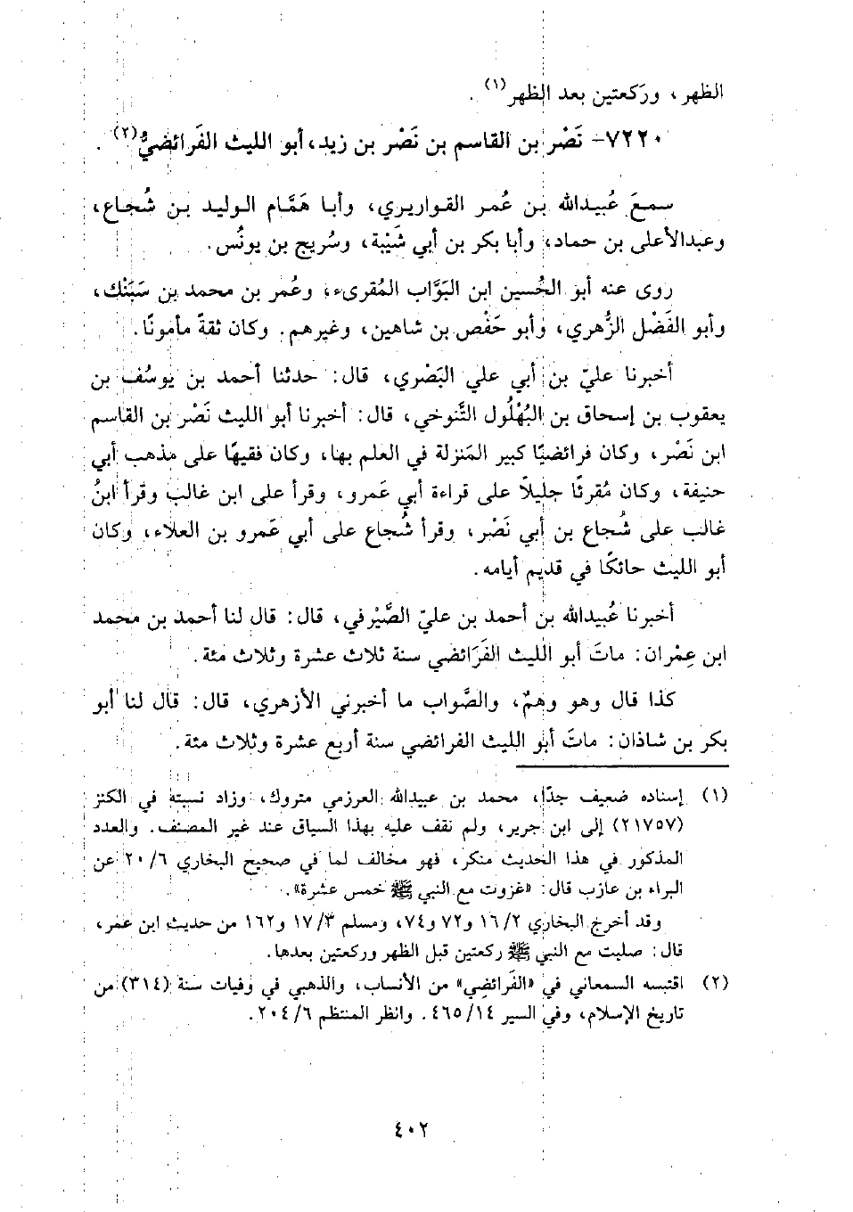 7220 - نصر بن القاسم بن نصر بن زيد أَبُو الليث الفرائضي سمع: عبيد الله بن عُمَر القواريري، وأبا همام الوليد بن شجاع، وعبد الأعلى بن حماد، وأبا بكر بن أبي شيبة، وسريج بن يونس.