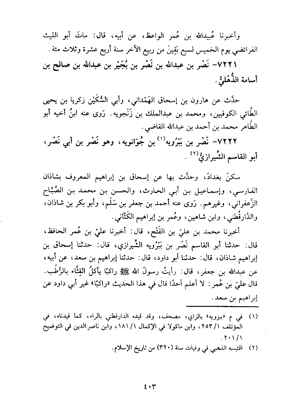 7222 - نصر بن ببرويه بن جوانويه وهو نصر بن أبي نصر أَبُو القاسم الشيرازي سكن بغداد، وحدث بها عن: إسحاق بن إبراهيم المعروف بشاذان الفارسي، وإسماعيل بن أبي الحارث، والحسن بن مُحَمَّد الصباح الزعفراني، وغيرهم.