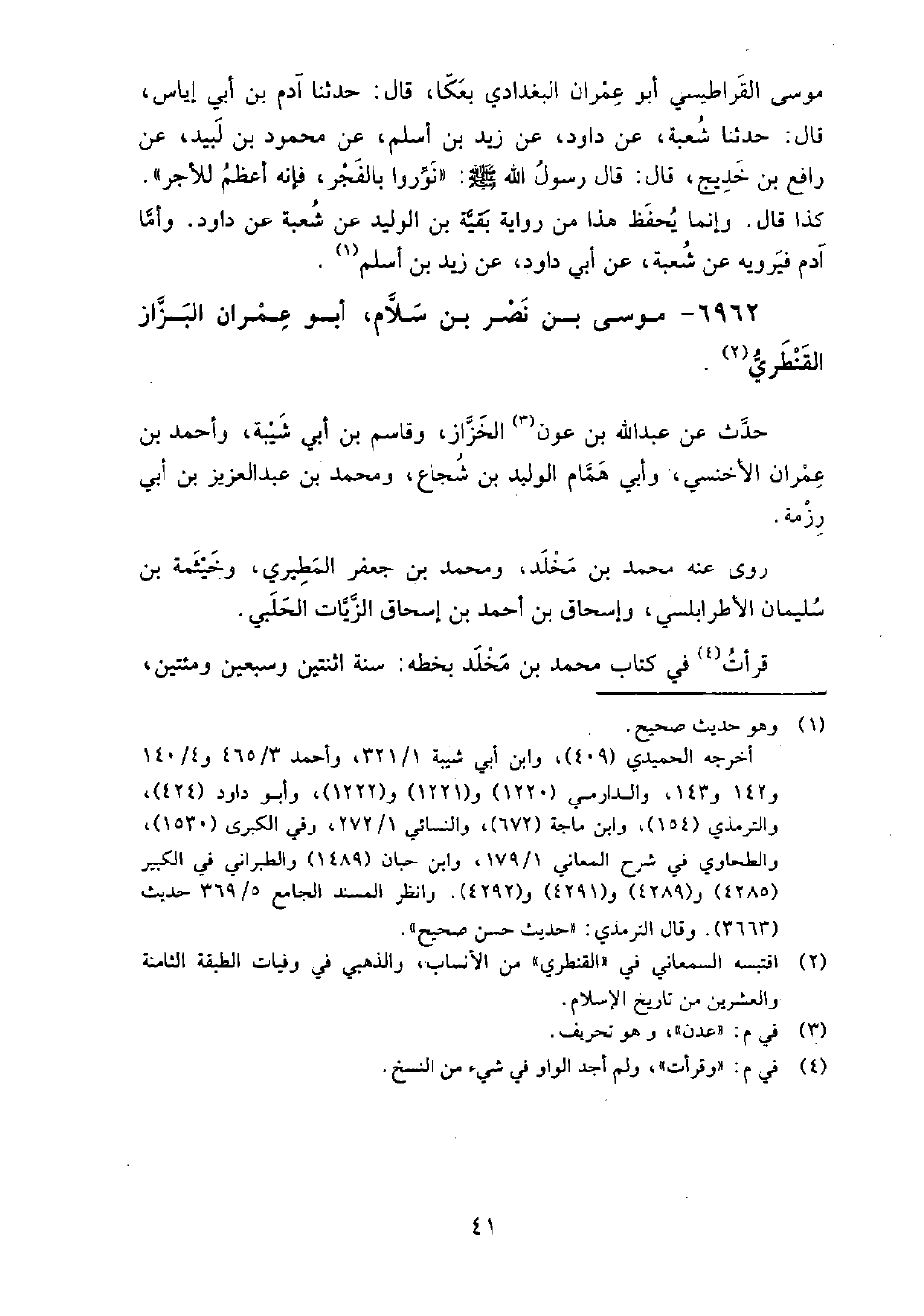 6962 - موسى بن نصر بن سلام أبو عمران البزاز القنطري حدث عن: عبد الله بن عون الخزاز، وقاسم بن أبي شيبة، وأحمد بن عمران الأخنسي، وأبي همام الوليد بن شجاع، ومحمد بن عبد العزيز بن أبي رزمة.