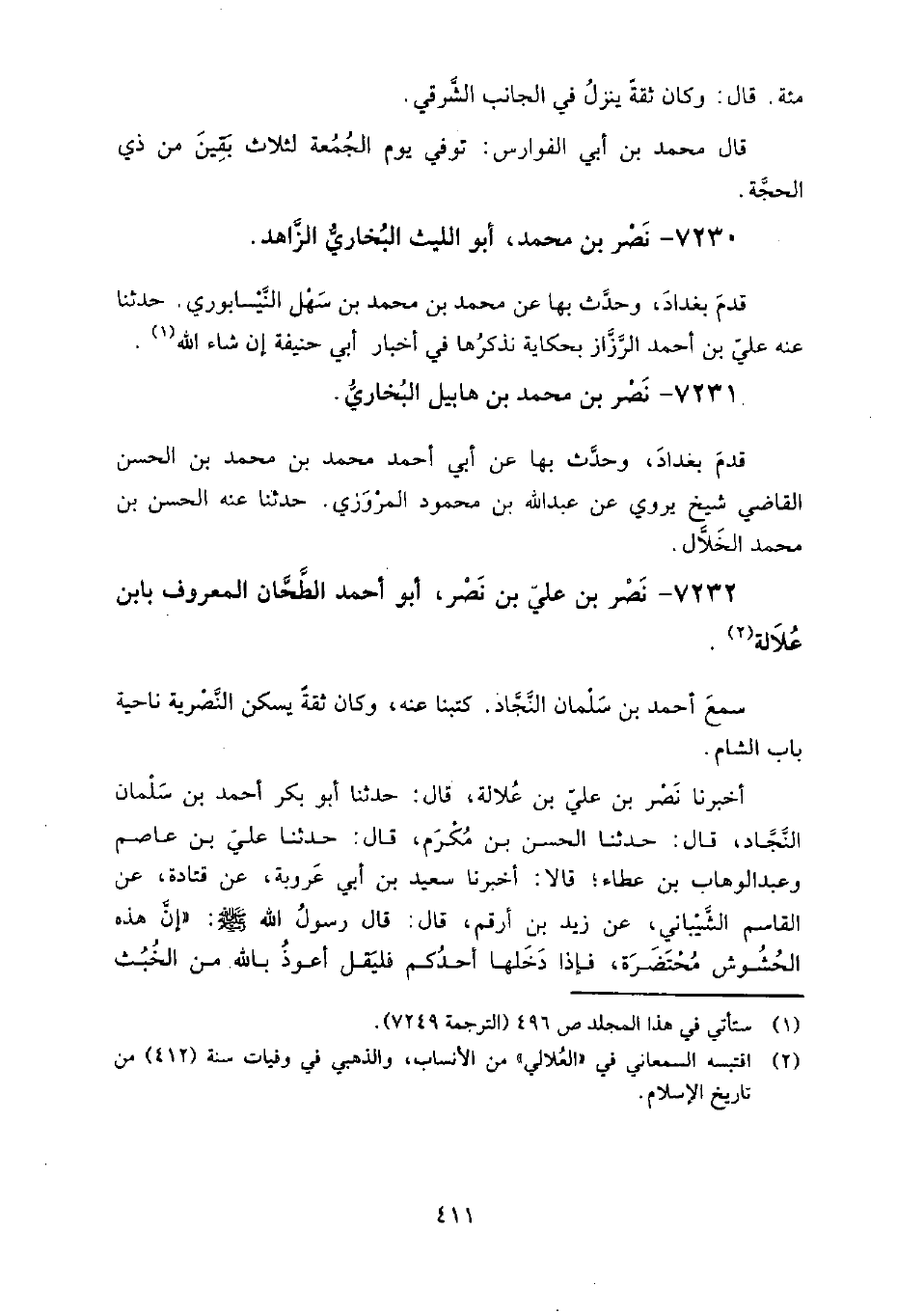 7230 - نصر بن مُحَمَّد أَبُو الليث البخاري الزاهد قدم بغداد، وحدث بها عن: مُحَمَّد بن مُحَمَّد بن سهل النيسابوري، قَالَ: حَدَّثَنَا عنه: علي بن أَحْمَد الرزاز بحكاية نذكرها في أخبار أبي حنيفة إن شاء الله.