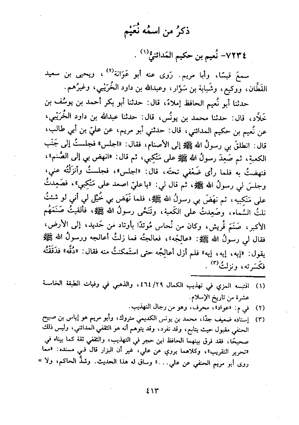 (4527) -[15: 413] حَدَّثَنَا أَبُو نُعَيْمٍ الْحَافِظُ إِمْلاءً، قَالَ: حَدَّثَنَا أَبُو بَكْرٍ أَحْمَدُ بْنُ يُوسُفَ بْنِ خَلادٍ، قَالَ: حَدَّثَنَا مُحَمَّدُ بْنُ يُونُسَ، قَالَ: حَدَّثَنَا عَبْدُ اللَّهِ بْنُ دَاوُدَ الْخُرَيْبِيُّ، عَنْ نُعَيْمِ بْنِ حَكِيمٍ الْمَدَائِنِيِّ، قَالَ: حَدَّثَنِي أَبُو مَرْيَمَ، عَنْ عَلِيِّ بْنِ أَبِي طَالِبٍ، قَالَ: انْطَلَقَ بِي رَسُولُ اللَّهِ صَلَّى اللَّهُ عَلَيْهِ وَسَلَّمَ إِلَى الأَصْنَامِ، فَقَالَ: " اجْلِسْ، فَجَلَسْتُ إِلَى جَنْبِ الْكَعْبَةِ، ثُمَّ صَعِدَ رَسُولُ اللَّهِ صَلَّى اللَّهُ عَلَيْهِ وَسَلَّمَ عَلَى مَنْكِبِي، ثُمَّ قَالَ: انْهَضْ بِي إِلَى الصَّنَمِ، فَنَهَضْتُ بِهِ، فَلَمَّا رَأَى ضَعْفِي تَحْتَهُ، قَالَ: اجْلِسْ، فَجَلَسْتُ وَأَنْزَلْتُهُ عَنِّي، وَجَلَسَ لِي رَسُولُ اللَّهِ صَلَّى اللَّهُ عَلَيْهِ وَسَلَّمَ ثُمَّ قَالَ لِي: يَا عَلِيُّ، اصْعَدْ عَلَى مَنْكِبِي، فَصَعِدْتُ عَلَى مَنْكِبَيْهِ، ثُمَّ نَهَضَ بِي رَسُولُ اللَّهِ صَلَّى اللَّهُ عَلَيْهِ وَسَلَّمَ فَلَمَّا نَهَضَ بِي خُيِّلَ لِي أَنِّي لَوْ شِئْتُ نِلْتُ السَّمَاءَ، وَصَعِدْتُ عَلَى الْكَعْبَةِ، وَتَنَحَّى رَسُولُ اللَّهِ صَلَّى اللَّهُ عَلَيْهِ وَسَلَّمَ فَأَلْقَيْتُ صَنَمَهُمُ الأَكْبَرَ: صَنَمَ قُرَيْشٍ، وَكَانَ مِنْ نُحَاسٍ مُوتَدًا بِأَوْتَادٍ مِنْ حَدِيدٍ إِلَى الأَرْضِ، فَقَالَ لِي رَسُولُ اللَّهِ صَلَّى اللَّهُ عَلَيْهِ وَسَلَّمَ: " عَالِجْهُ "، فَعَالَجْتُهُ، فَمَا زِلْتُ أُعَالِجُهُ وَرَسُولُ اللَّهِ صَلَّى اللَّهُ عَلَيْهِ وَسَلَّمَ يَقُولُ: " إِيهٍ إِيهٍ إِيهٍ "، فَلَمْ أَزَلْ أُعَالِجُهُ حَتَّى اسْتَمْكَنْتُ مِنْهُ، فَقَالَ: " دُقَّهُ "، فَدَقَقْتُهُ، فَكَسَرْتُهُ، وَنَزَلْتُ " أَخْبَرَنَا علي بن مُحَمَّد بن عبد الله المعدل، قَالَ: أَخْبَرَنَا عثمان بن أَحْمَد الدقاق، قال لي: قرئ على مُحَمَّد بن أَحْمَد بن البراء، وأنا حاضر، قال: قال علي بن عبد الله المديني: قد روى عن نعيم، يعني: ابن حكيم: يحيى بن سعيد القطان، وأبو عوانة، وَمُحَمَّد بن بشر العبدي، وعبيد الله بن موسى أنبأنا أَحْمَد بن مُحَمَّد بن عبد الله الكاتب، قال: أخبرنا مُحَمَّد بن حميد المخرمي، قَالَ: حَدَّثَنَا علي بن الحسين بن حبان، قال: وجدت في كتاب أبي بخط يده: قال أَبُو زكريا: نعيم بن حكيم، وعبد الملك بن حكيم أخوان جميعا، حدث عنهما: شبابة، وكان نعيم أثبتهما، وأكبرهما أَخْبَرَنَا علي بن الحسين صاحب العباسي، قَالَ: أَخْبَرَنَا عَبْد الرَّحْمَن بن عُمَر الخلال، قَالَ: حَدَّثَنَا مُحَمَّد بن إِسْمَاعِيل الفارسي، قَالَ: حَدَّثَنَا بكر بن سهل، قَالَ: حَدَّثَنَا عبد الخالق بن منصور، قال: وسئل يحيى بن معين عن نعيم بن حكيم الذي يروي عنه عبيد الله بن موسى، فقال: ثقة أَخْبَرَنَا حمزة بن مُحَمَّد بن طاهر، قَالَ: حَدَّثَنَا الوليد بن بكر الأندلسي، قَالَ: حَدَّثَنَا علي بن أَحْمَد بن زكريا الهاشمي، قَالَ: حَدَّثَنَا أَبُو مسلم صالح بن أَحْمَد بن عبد الله العجلي، قَالَ: حَدَّثَنِي أبي، قال: نعيم بن حكيم ثقة من أهل المدائن أَخْبَرَنَا علي بن طلحة المقرئ، قَالَ: أَخْبَرَنَا أَبُو الفتح مُحَمَّد بن إبراهيم الغازي، قَالَ: أَخْبَرَنَا مُحَمَّد بن مُحَمَّد بن داود الكرجي، قَالَ: حَدَّثَنَا عَبْد الرَّحْمَن بن يوسف بن خراش، قال: نعيم بن حكيم صدوق، لا بأس به أَخْبَرَنَا العتيقي، قَالَ: أَخْبَرَنَا مُحَمَّد بن عدي البصري في كتابه، قَالَ: حَدَّثَنَا أَبُو عبيد مُحَمَّد بن علي الآجري، قال: قلت لأبي داود سمع يحيى القطان من نعيم بن حكيم؟ قال: نعم، قلت: سنة كم مات نعيم بن حكيم؟ فقال: سنة ثمان وأربعين، يعني: ومائة