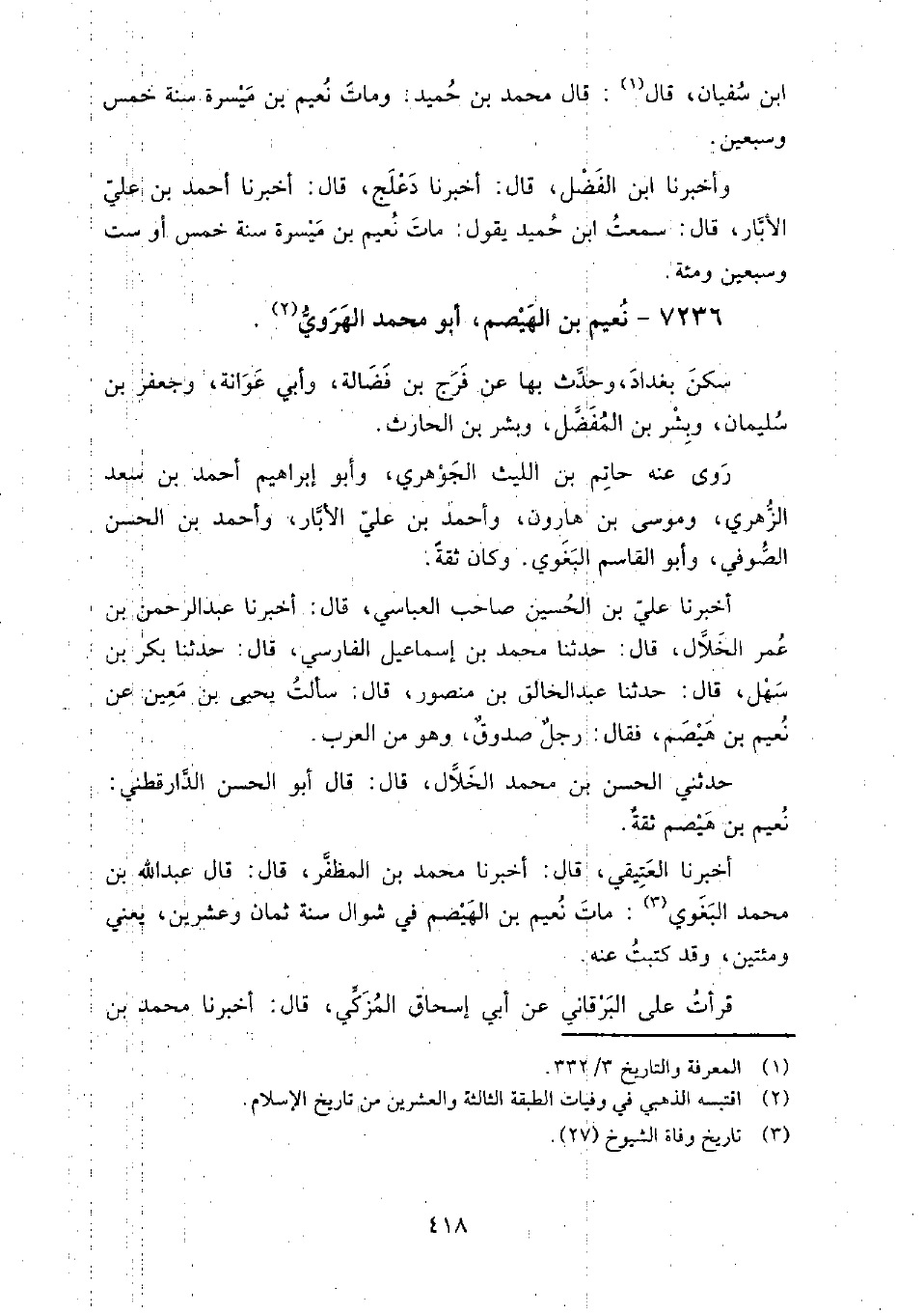 7236 - نعيم بن الهيصم أَبُو مُحَمَّد الهروي سكن بغداد، وحدث بها عن: فرج بن فضالة، وأبي عوانة، وجعفر بن سليمان، وبشر بن المفضل، وبشر بن الحارث.