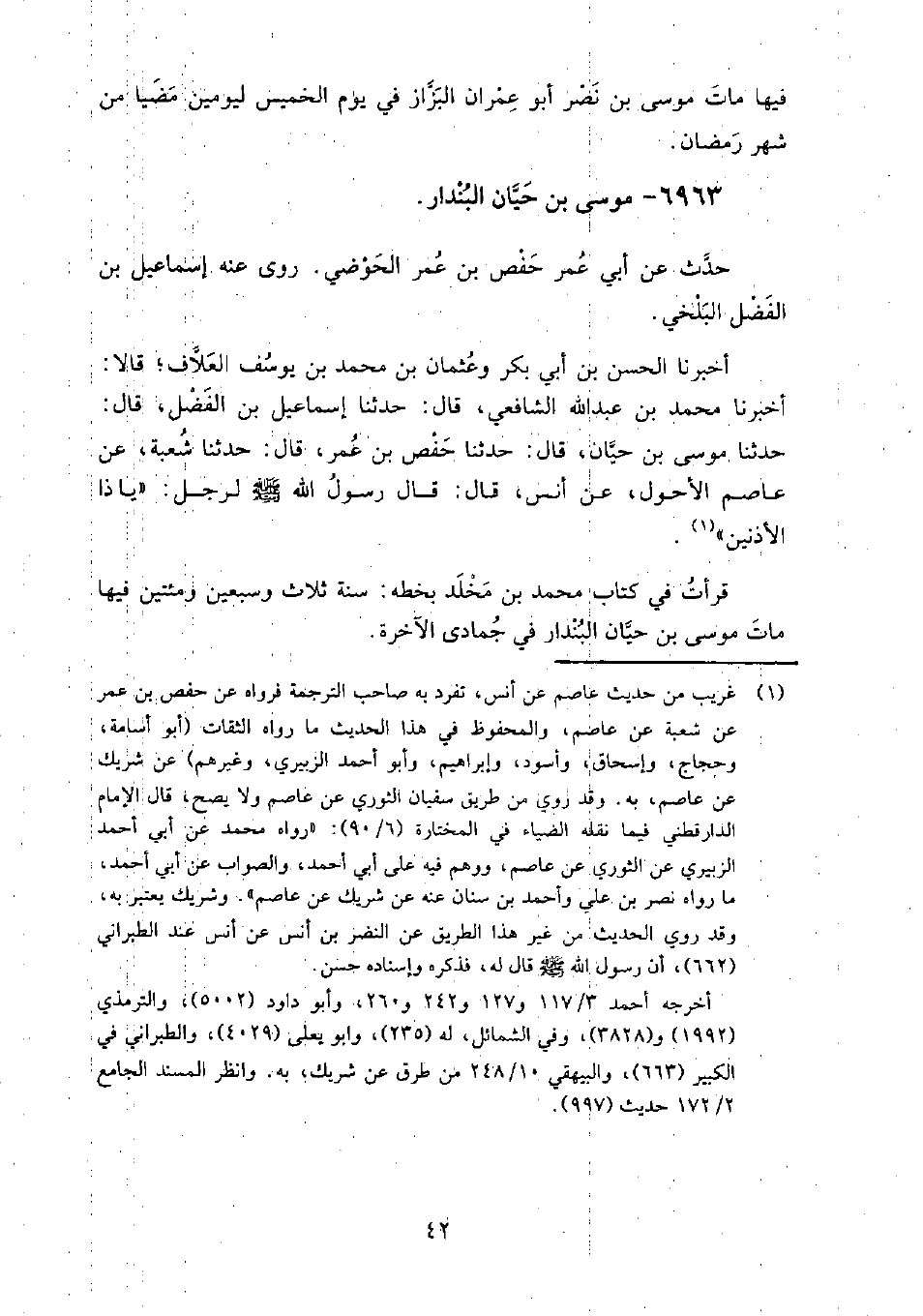 6963 - موسى بن حيان البندار حدث عن: أبي عمر حفص بن عمر الحوضي.