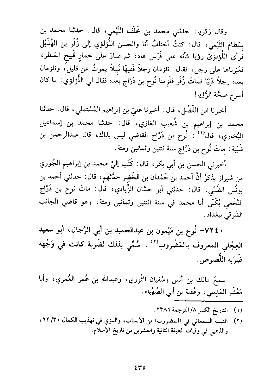 7240 - نوح بن ميمون بن عبد الحميد بن أبي الرجال، أَبُو سعيد العجلي، المعروف بالمضروب، سمي بذلك لضربة كانت في وجهه ضربه اللصوص سمع: مالك بن أنس، وسفيان الثوري، وعبد الله بن عُمَر العمري، وأبا معشر المديني، وعقبة بن أبي الصهباء.