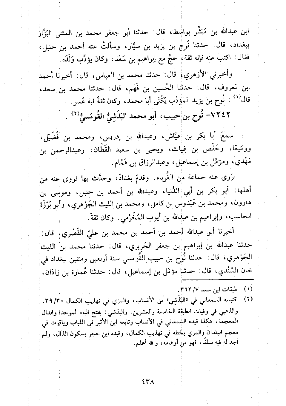 7242 - نوح بن حبيب أَبُو مُحَمَّد البذشي القومسي سمع: أبا بكر بن عياش، وعبد الله بن إدريس، وَمُحَمَّد بن فضيل، ووكيعا، وحفص بن غياث، ويحيى بن سعيد القطان، وعَبْد الرَّحْمَن بن مهدي، ومؤمل بن إِسْمَاعِيل، وعبد الرزاق بن همام.