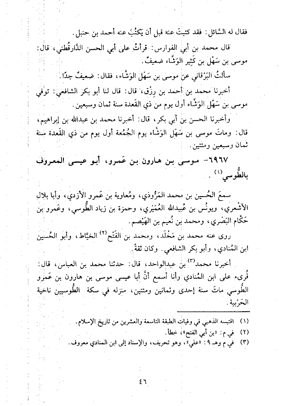 6967 - موسى بن هارون بن عمرو أبو عيسى المعروف بالطوسي سمع: الحسين بن محمد المروذي، ومعاوية بن عمرو الأزدي، وأبا بلال الأشعري، ويونس بن عبيد الله العميري، وحمزة بن زياد الطوسي، وعمرو بن حكام البصري، ومحمد بن نعيم بن الهيصم.