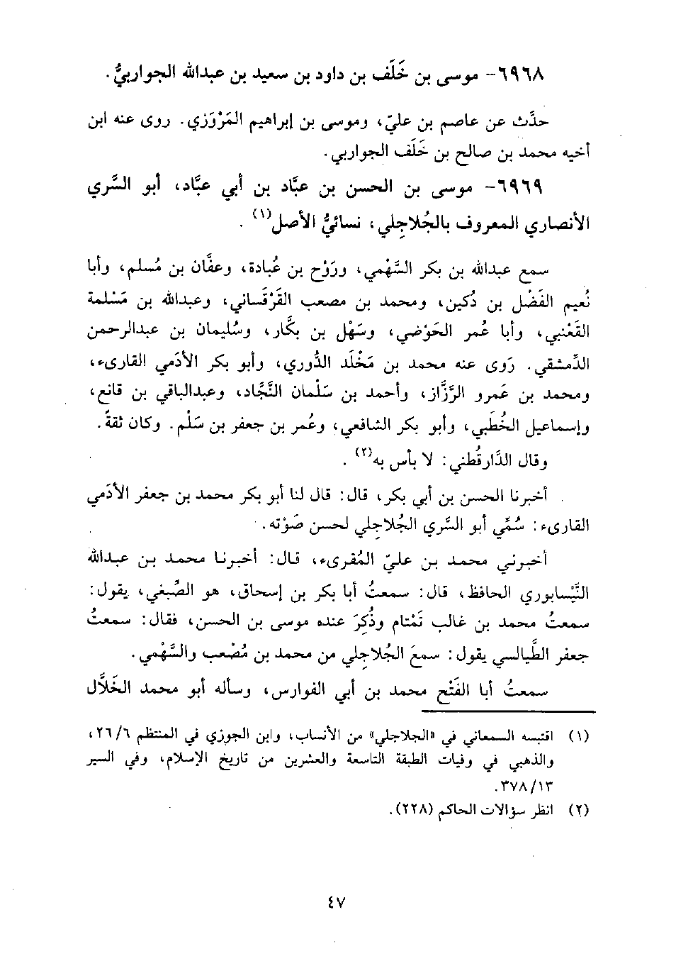 6968 - موسى بن خلف بن داود سعيد بن عبد الله الجواربي حدث عن عاصم بن علي، وموسى بن إبراهيم المروزي.