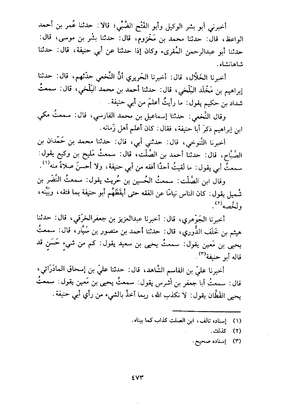 أَخْبَرَنِي أَبُو الوليد الحسن بن مُحَمَّد الدربندي، قَالَ: أَخْبَرَنَا مُحَمَّد بن أَحْمَد بن سليمان الحافظ ببخارى، قال: سمعت علي بن الحسن بن عبد الرحيم الكندي، يقول: سمعت أبا مُحَمَّد عبد الله بن مُحَمَّد بن عُمَر الأديب، يقول: سمعت يَعْقُوب بن إبراهيم بن أبي خيران، يقول: سمعت الحسن بن عثمان الْقَاضِي، يقول: وجدت العلم بالعراق والحجاز ثلاثة: علم أبي حنيفة، وتفسير الكلبي، ومغازي مُحَمَّد بن إسحاق أَخْبَرَنَا الصيمري، قَالَ: أَخْبَرَنَا عُمَر بن إبراهيم، قَالَ: حَدَّثَنَا مكرم بن أَحْمَد، قَالَ: حَدَّثَنَا أَحْمَد بن عطية، قال: سمعت يحيى بن معين، يقول: القراءة عندي: قراءة حمزة، والفقه: فقه أبي حنيفة، على هذا أدركت الناس.