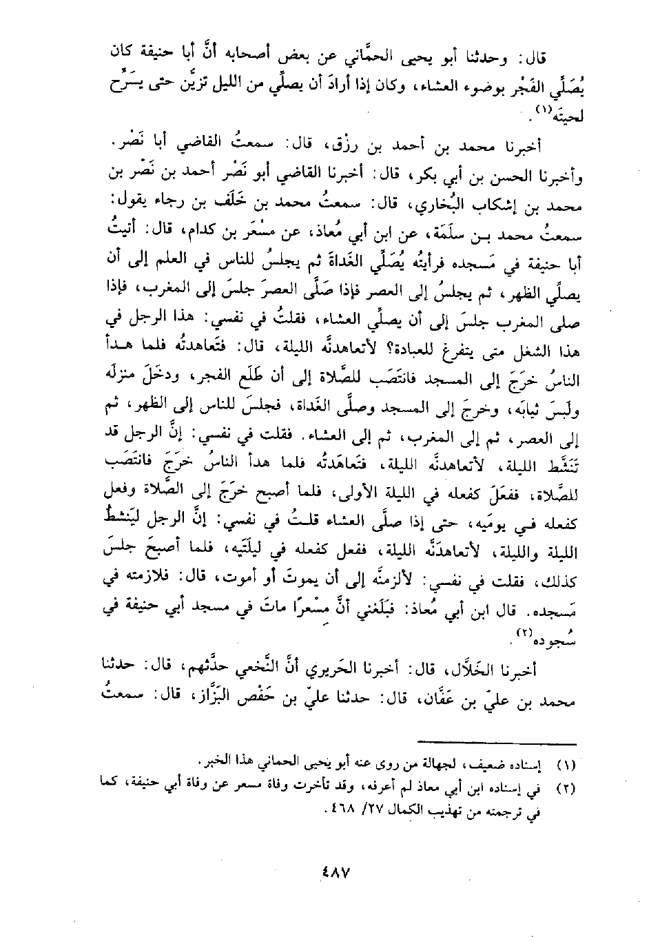 أَخْبَرَنَا مُحَمَّد بن أَحْمَد بن رزق، قَالَ: سَمِعْتُ الْقَاضِي أَبَا نصر وَأَخْبَرَنَا الحَسَن بن أَبِي بَكْر، قَالَ: أَخْبَرَنَا الْقَاضِي أَبُو نصر أَحْمَد بن نصر بن مُحَمَّد بن إشكاب البُخَارِي، قَالَ: سَمِعْتُ مُحَمَّد بن خلف بن رجاء، يَقُولُ: سَمِعْتُ مُحَمَّد بن سلمة، عن ابن أَبِي معاذ، عن مسعر بن كدام، قَالَ: أتيت أَبَا حنيفة في مسجده، فرأيته يصلي الغداة، ثُمَّ يجلس للناس في العلم إلى أن يصلي الظهر، ثم يجلس إلى العصر، فإذا صلى العصر جلس إلى المغرب، فإذا صلى المغرب جلس إلى أن يصلي العشاء، فَقُلْتُ في نفسي: هَذَا الرجل في هَذَا الشغل مَتَى يفرغ للعبادة؟ لأتعاهدنه الليلة، قَالَ: فتعاهدته، فَلَمَّا هدأ النَّاس، خرج إلى المسجد فانتصب للصلاة إلى أن طلع الفجر، ودخل منزله ولبس ثيابه، وخرج إلى المسجد وصلى الغداة، فجلس للنَّاس إلى الظهر، ثُمَّ إلى العصر، ثُمَّ إلى المغرب، ثُمَّ إلى العشاء، فَقُلْتُ في نفسي: إِنَّ الرجل قد تنشط الليلة، لأتعاهدنه الليلة، فتعاهدته، فَلَمَّا هدأ النَّاس خرج فانتصب للصلاة، ففعل كفعله في الليلة الأولى، فَلَمَّا أصبح خرج إلى الصَّلاة، وفعل كفعله في يوميه، حَتَّى إِذَا صلى العشاء قُلْتُ في نفسي: إِنَّ الرجل لينشط الليلة والليلة، لأتعاهدنه الليلة، ففعل كفعله في ليلتيه، فَلَمَّا أصبح جلس كذلك، فَقُلْتُ في نفسي: لألزمنه إلى أن يموت أَوْ أموت، قَالَ: فلازمته في مسجده، قَالَ ابن أَبِي معاذ: فبلغني أَنَّ مسعرًا مات في مسجد أَبِي حنيفة في سجوده