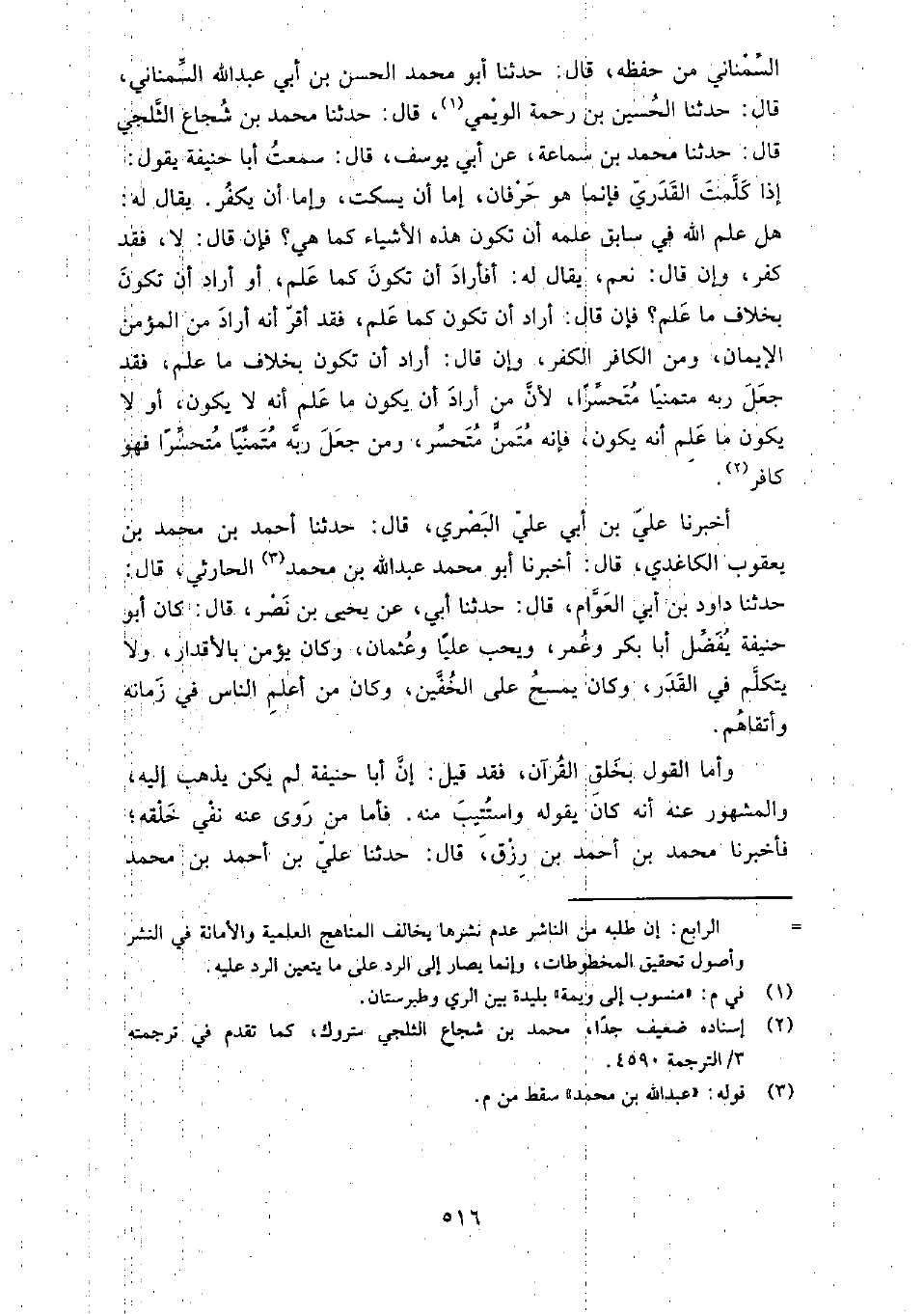 حَدَّثَنَا الْقَاضِي أَبُو جَعْفَر السمناني، قَالَ: حَدَّثَنَا الحَسَن بن أَبِي عَبْد الله السمناني، قَالَ: حَدَّثَنَا الحُسَيْن بن رحمة الويمي، قَالَ: حَدَّثَنَا شجاع الثلجي، قَالَ: حَدَّثَنَا مُحَمَّد بن سماعة، عن أَبِي يُوسُف، قَالَ: ناظرت أَبَا حنيفة ستة أشهر، حَتَّى قَالَ: من قَالَ: القُرْآن مخلوق فَهُوَ كافر.