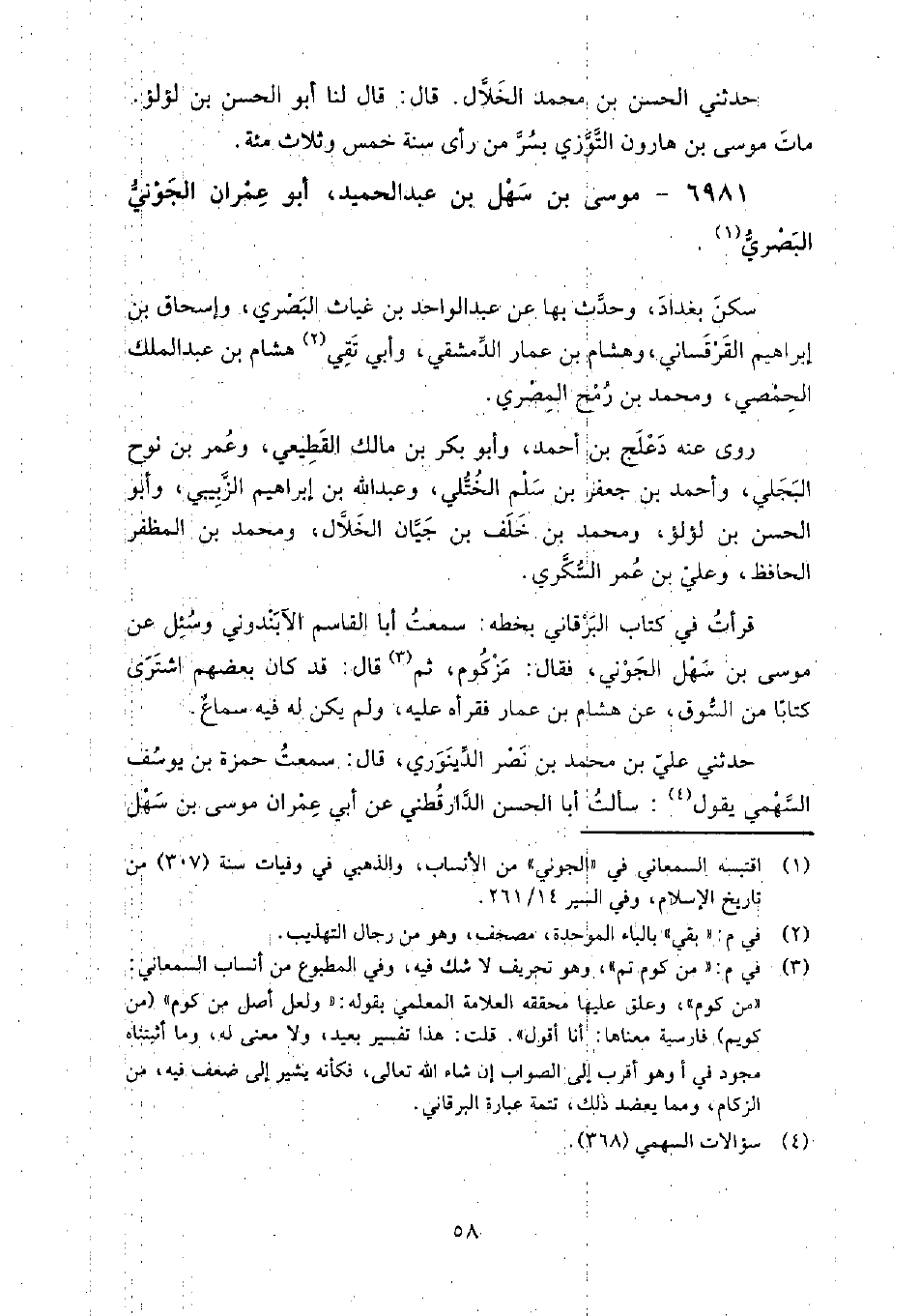 6981 - موسى بن سهل بن عبد الحميد أبو عمران الجوني البصري سكن بغداد، وحدث بها عن عبد الواحد بن غياث البصري، وإسحاق بن إبراهيم القرقساني، وهشام بن عمار الدمشقي، وأبي تقي هشام بن عبد الملك الحمصي، ومحمد بن رمح المصري.