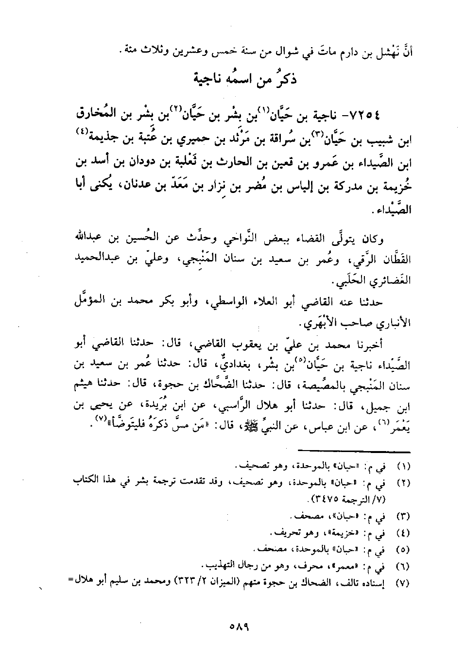 7254 - ناجية بن حَيَّان بن بشر بن حَيَّان بن المخارق بن شبيب بن حَيَّان بن سراقة بن مرثد بن حميري بن عتبة بن جذيمة ابن الصيداء بن عمرو بن قعين بن الحارث بن ثعلبة بن دودان بن أسد بن خزيمة بن مدركة بن الياس بن مضر بن نزار بن معد بن عدنان، يكنى: أبا الصيداء