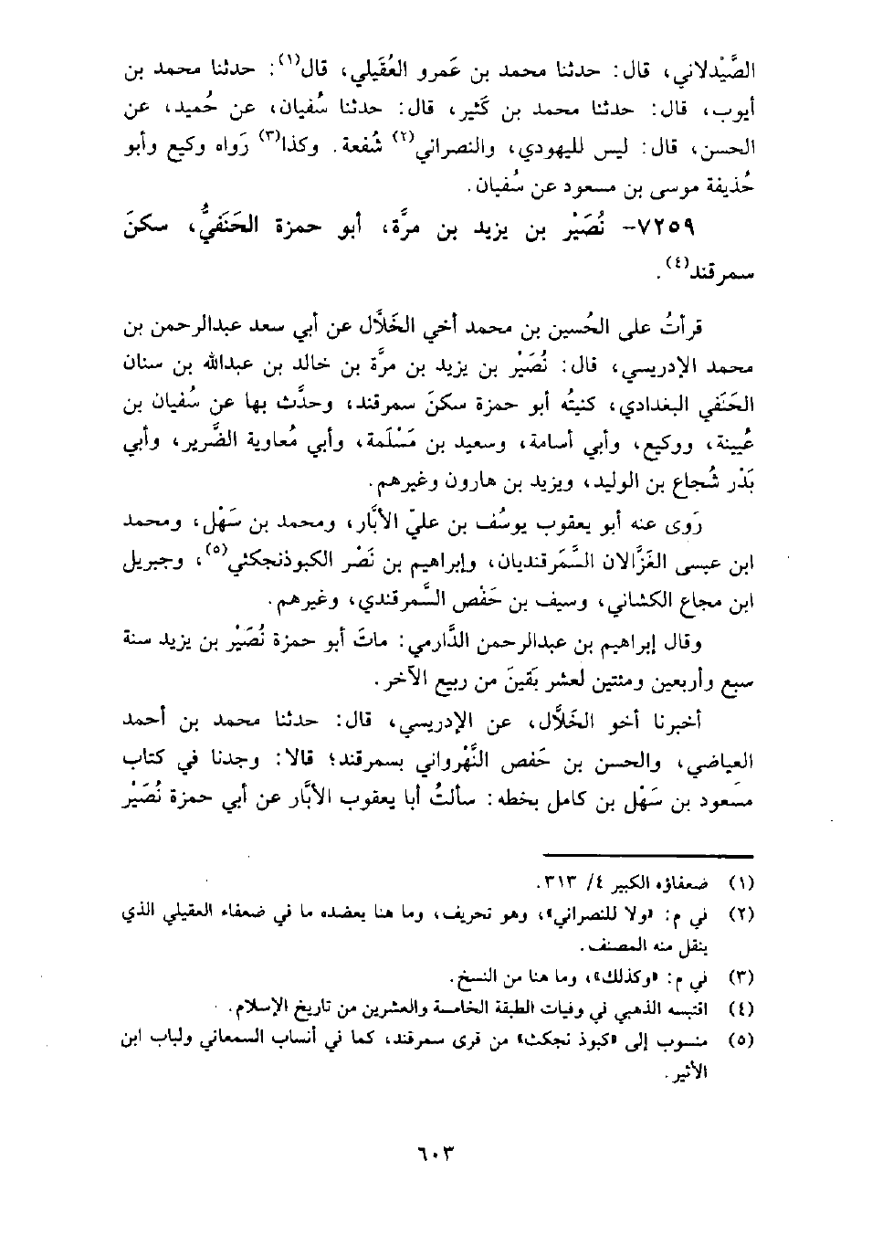 7259 - نصير بن يزيد بن مرة أَبُو حمزة الحنفي، سكن سمرقند قرأت على الحسين بن مُحَمَّد أخي الخلال، عن أبي سعد عَبْد الرَّحْمَن بن مُحَمَّد الإدريسي، قال: نصير بن يزيد بن مرة بن خالد بن عبد الله بن سنان الحنفي البغدادي، كنيته: أَبُو حمزة، سكن سمرقند، وحدث بها عن: سفيان بن عيينة، ووكيع، وأبي أسامة، وسعيد بن مسلمة، وأبي معاوية الضرير، وأبي بدر شجاع بن الوليد، ويزيد بن هارون، وغيرهم.