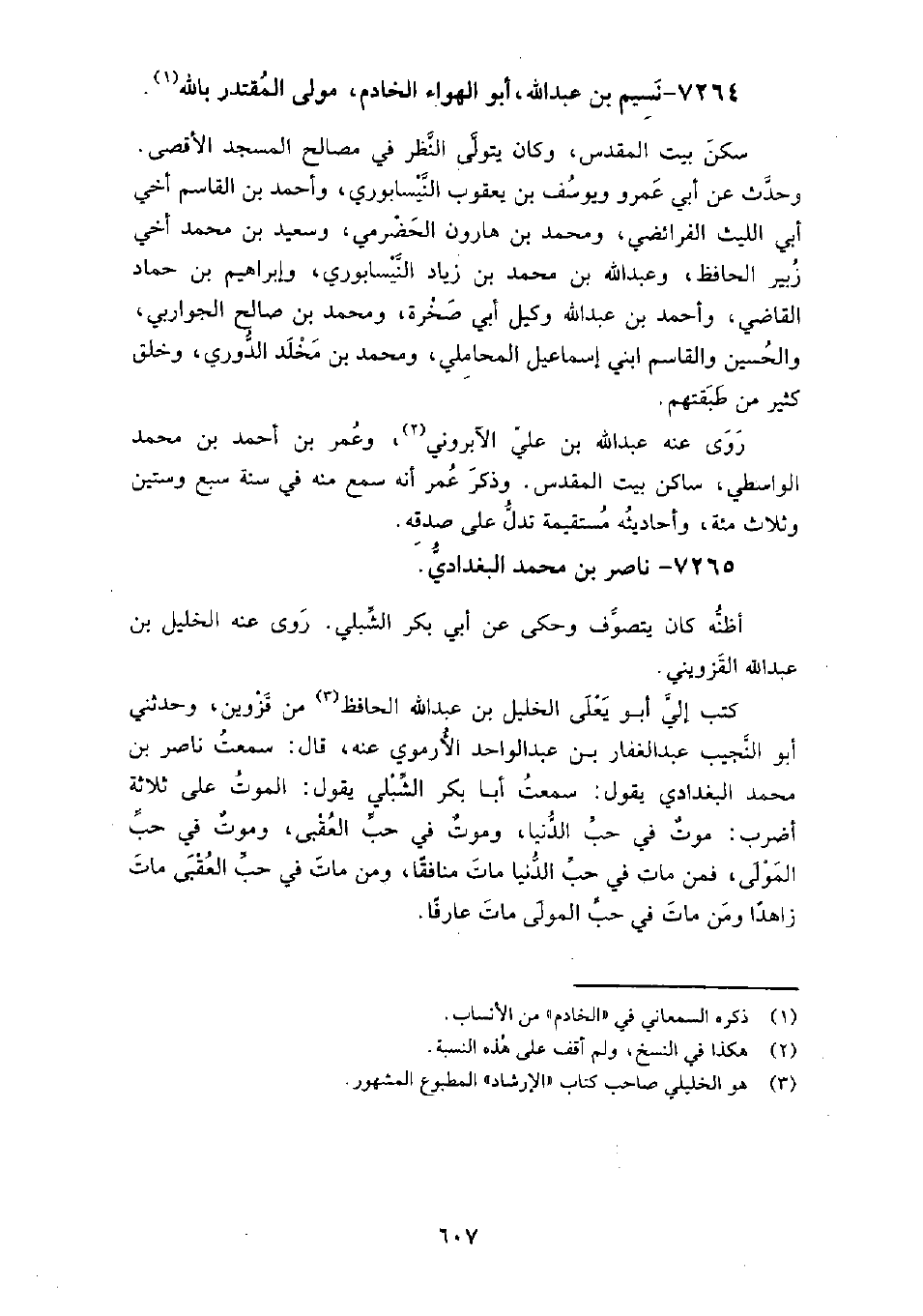 7264 - نسيم بن عبد الله أَبُو الهواء الخادم مولى المقتدر بالله سكن بيت المقدس، وكان يتولى النظر في مصالح المسجد الأقصى، وحدث عن: أبي عمرو، ويوسف بن يَعْقُوب النيسابوري، وأحمد بن القاسم أخي أبي الليث الفرائضي، وَمُحَمَّد بن هارون الحضرمي، وسعيد بن مُحَمَّد أخي زبير الحافظ، وعبد الله بن مُحَمَّد بن زياد النيسابوري، وإبراهيم بن حماد الْقَاضِي، وأحمد بن عبد الله وكيل أبي صخرة، وَمُحَمَّد بن صالح الجواربي، والحسين، والقاسم ابني إِسْمَاعِيل المحاملي، وَمُحَمَّد بن مخلد الدوري، وخلق كثير من طبقتهم.