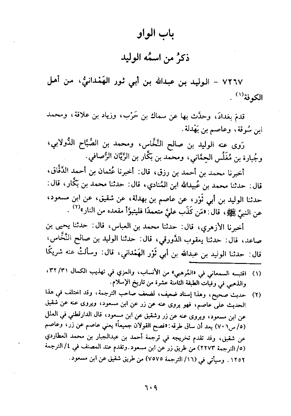 7267 - الوليد بن عبد الله بن أبي ثور الهمداني من أهل الكوفة، قدم بغداد، وحدث بها عن: سماك بن حرب، وزياد بن علاقة، وَمُحَمَّد بن سوقة، وعاصم بن بهدلة.