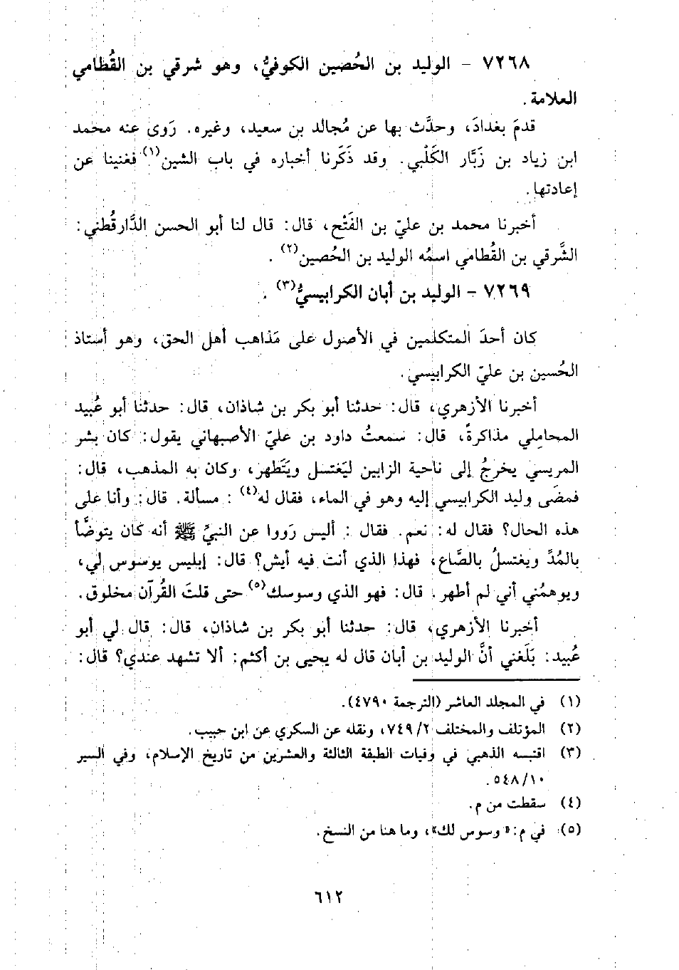7269 - الوليد بن أبان الكرابيسي كان أحد المتكلمين في الأصول على مذاهب أهل الحق، وهو أستاذ الحسين بن علي الكرابيسي.