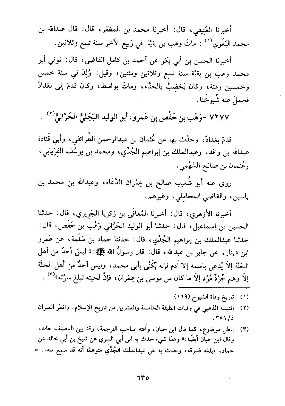 7277 - وهب بن حفص بن عمرو أَبُو الوليد البجلي الحراني قدم بغداد، وحدث بها عن: عثمان بن عَبْد الرَّحْمَن الطرائفي، وأبي قتادة عبد الله بن واقد، وعبد الملك بن إبراهيم الجدي، وَمُحَمَّد بن يوسف الفريابي، وعثمان بن صالح السهمي.