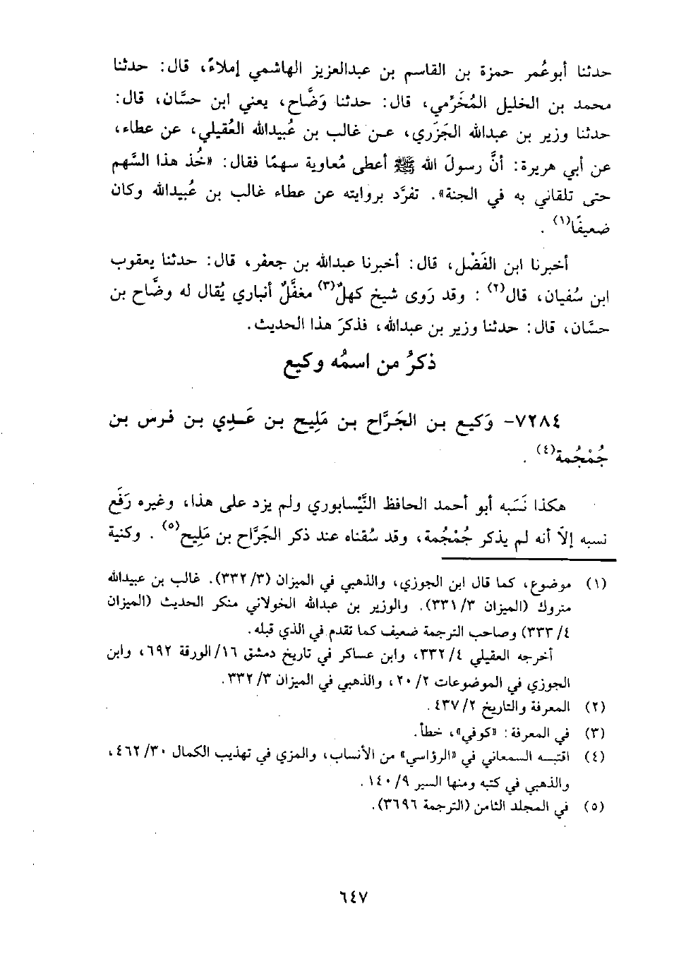 7284 - وكيع بن الجراح بن مليح بن عدي بن فرس بن جمجمة هكذا نسبه أبو أحمد الحافظ النيسابوري، ولم يزد على هذا، وغيره رفع نسبه، إلا أنه لم يذكر جمجمة، وقد سقناه عند ذكر الجراح بن مليح، وكنية وكيع: أَبُو سفيان الرؤاسي الكوفي، من قيس عيلان، قيل: إن أصله من قرية من قرى نيسابور، وقيل: بل أصله من السغد.