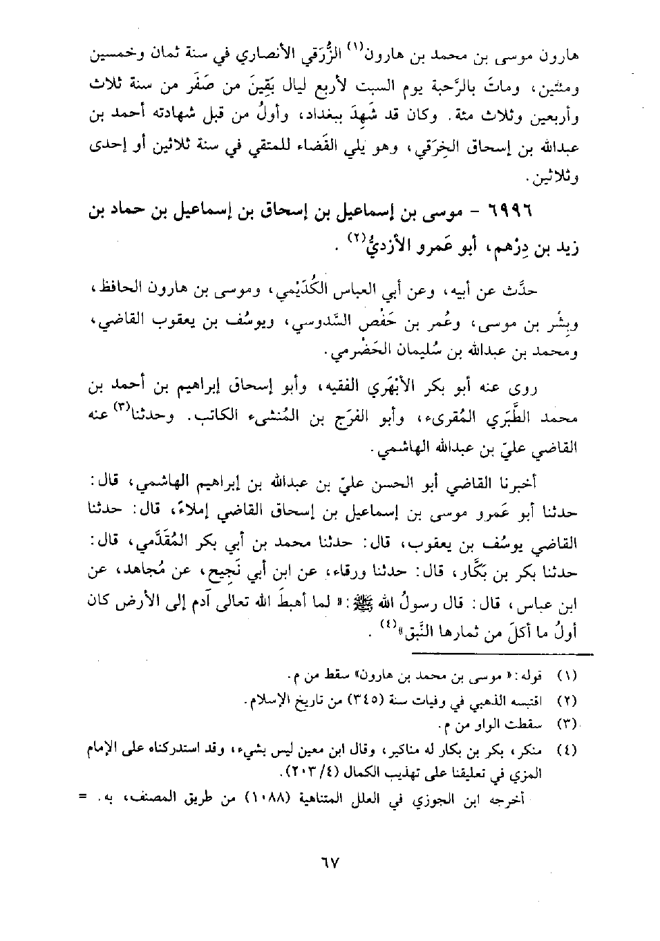 (4376) -[15: 67] أَخْبَرَنَا الْقَاضِي أَبُو الْحَسَنِ عَلِيُّ بْنُ عَبْدِ اللَّهِ بْنِ إِبْرَاهِيمَ الْهَاشِمِيُّ، قَالَ: حَدَّثَنَا أَبُو عَمْرٍو مُوسَى بْنُ إِسْمَاعِيلَ بْنِ إِسْحَاقَ الْقَاضِي إِمْلاءً، قَالَ: حَدَّثَنَا الْقَاضِي يُوسُفُ بْنُ يَعْقُوبَ، قَالَ: حَدَّثَنَا مُحَمَّدُ بْنُ أَبِي بَكْرٍ الْمُقَدَّمِيُّ، قَالَ: حَدَّثَنَا بَكْرُ بْنُ بَكَّارٍ، قَالَ: حَدَّثَنَا وَرْقَاءُ، عَنِ ابْنِ أَبِي نَجِيحٍ، عَنْ مُجَاهِدٍ، عَنِ ابْنِ عَبَّاسٍ، قَالَ: قَالَ رَسُولُ اللَّهِ صَلَّى اللَّهُ عَلَيْهِ وَسَلَّمَ: " لَمَّا أَهْبَطَ اللَّهُ تَعَالَى آدَمَ إِلَى الأَرْضِ كَانَ أَوَّلَ مَا أَكَلَ مِنْ ثِمَارِهَا: النَّبْقُ " أَخْبَرَنَا أبو محمد عبد الملك بن محمد بن محمد بن سلمان العطار، قَالَ: حَدَّثَنَا أبو بكر محمد بن عبد الله بن محمد بن صالح الأبهري، قَالَ: حَدَّثَنَا أبو عمرو موسى بن إسماعيل القاضي ببغداد، قَالَ: حَدَّثَنَا موسى بن هارون، قَالَ: حَدَّثَنَا خباب بن جبلة الدقاق، قَالَ: سمعت مالك بن أنس، يقول: ليس لمضيق مروءة قرأت في كتاب محمد بن علي بن عمر بن الفياض: ولد أبو عمرو موسى بن إسماعيل بن إسحاق القاضي في سنة ثلاث وسبعين ومائتين، ثم كانت وفاته في آخر سنة خمس وأربعين وثلاث مائة، أو في أول سنة ست وأربعين
