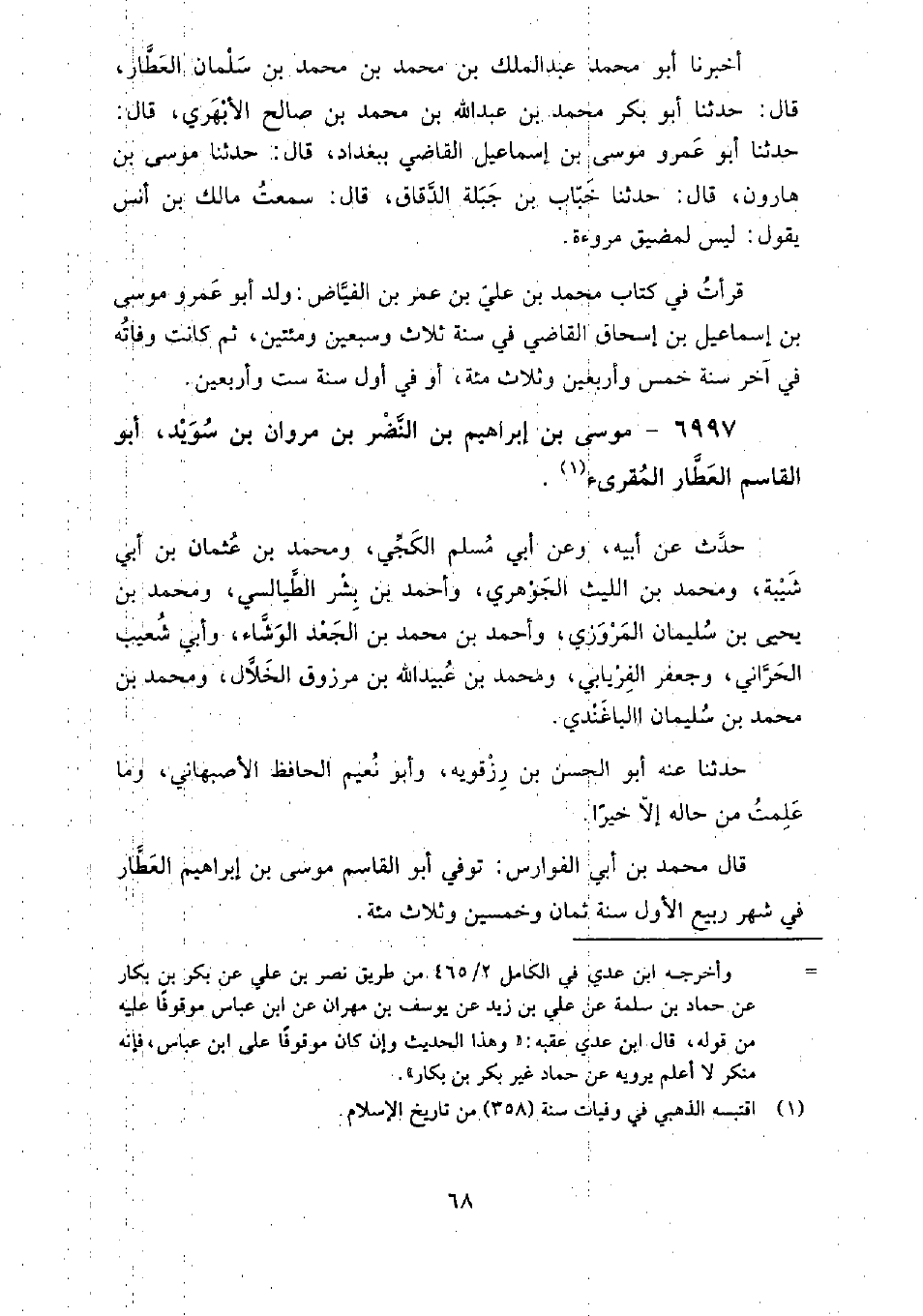 6997 - موسى بن إبراهيم بن النضر بن مروان بن سويد أبو القاسم العطار المقرئ حدث عن: أبيه، وعن أبي مسلم الكجي، ومحمد بن عثمان بن أبي شيبة، ومحمد بن الليث الجوهري، وأحمد بن بشر الطيالسي، ومحمد بن يحيى بن سليمان المروزي، وأحمد بن محمد بن الجعد الوشاء، وأبي شعيب الحراني، وجعفر الفريابي، ومحمد بن عبيد الله بن مرزوق الخلال، ومحمد بن محمد بن سليمان الباغندي.