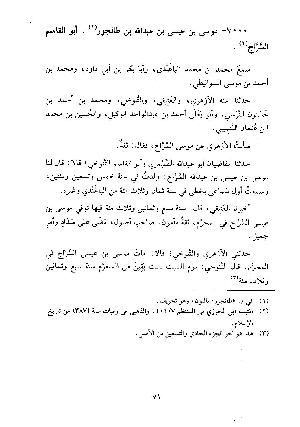 7000 - موسى بن عيسى بن عبد الله بن طالجور أبو القاسم السراج سمع: محمد بن محمد الباغندي، وأبا بكر بن أبي داود، ومحمد بن أحمد بن موسى السوانيطي.