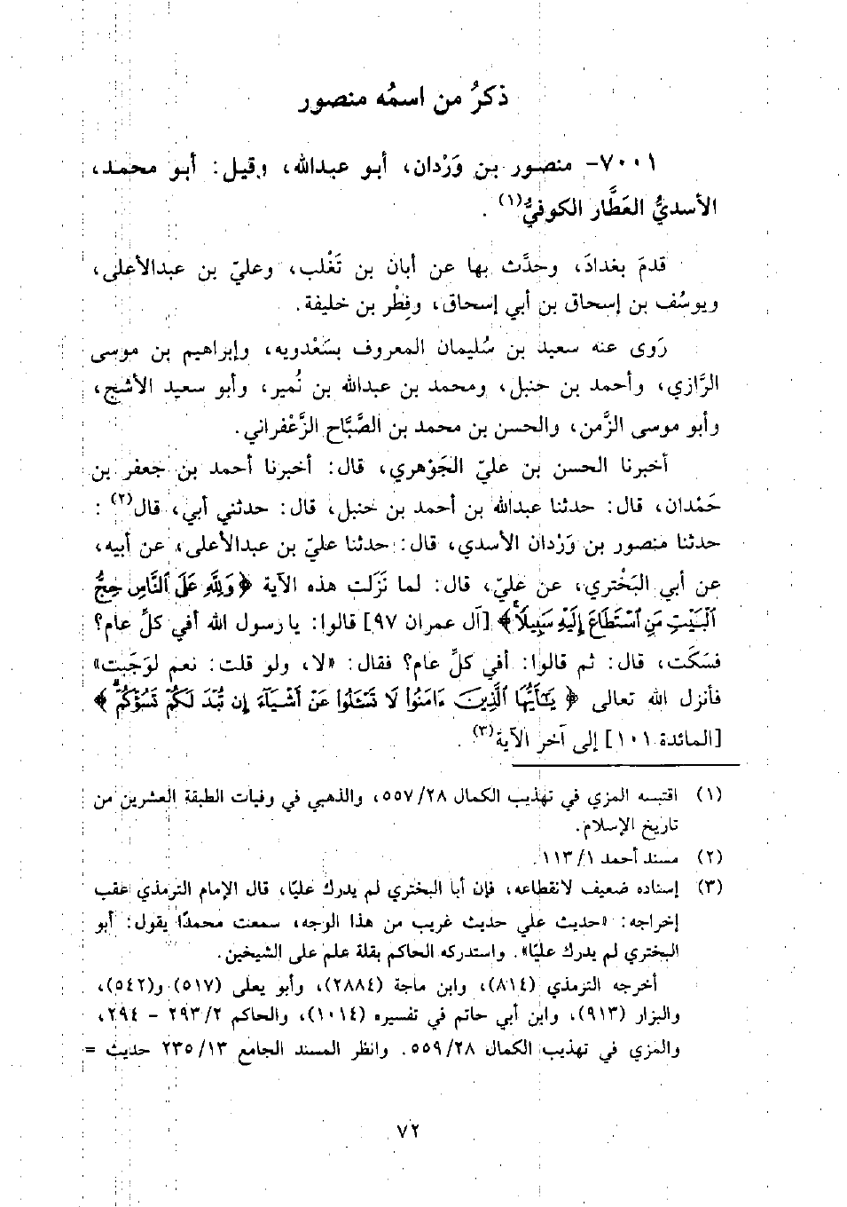 (4379) -[15: 72] أَخْبَرَنَا الْحَسَنُ بْنُ عَلِيٍّ الْجَوْهَرِيُّ، قَالَ: أَخْبَرَنَا أَحْمَدُ بْنُ جَعْفَرِ بْنِ حَمْدَانَ، قَالَ: حَدَّثَنَا عَبْدُ اللَّهِ بْنُ أَحْمَدَ بْنِ حَنْبَلٍ، قَالَ: حَدَّثَنِي أَبِي، قَالَ: حَدَّثَنَا مَنْصُورُ بْنُ وَرْدَانَ الأَسَدِيُّ، قَالَ: حَدَّثَنَا عَلِيُّ بْنُ عَبْدِ الأَعْلَى، عَنْ أَبِيهِ، عَنْ أَبِي الْبَخْتَرِيِّ، عَنْ عَلِيٍّ، قَالَ: لَمَّا نَزَلَتْ هَذِهِ الآيَةُ {وَلِلَّهِ عَلَى النَّاسِ حِجُّ الْبَيْتِ مَنِ اسْتَطَاعَ إِلَيْهِ سَبِيلا} قَالُوا: يَا رَسُولَ اللَّهِ، أَفِي كُلِّ عَامٍ؟ فَسَكَتَ، قَالَ: ثُمَّ قَالُوا: أَفِي كُلِّ عَامٍ؟ فَقَالَ: " لا، وَلَوْ قُلْتُ: نَعَمْ لَوَجَبَتْ "، فَأَنْزَلَ اللَّهُ تَعَالَى: {يَأَيُّهَا الَّذِينَ آمَنُوا لا تَسْأَلُوا عَنْ أَشْيَاءَ إِنْ تُبْدَ لَكُمْ تَسُؤْكُمْ} إِلَى آخِرِ الآيَةِ