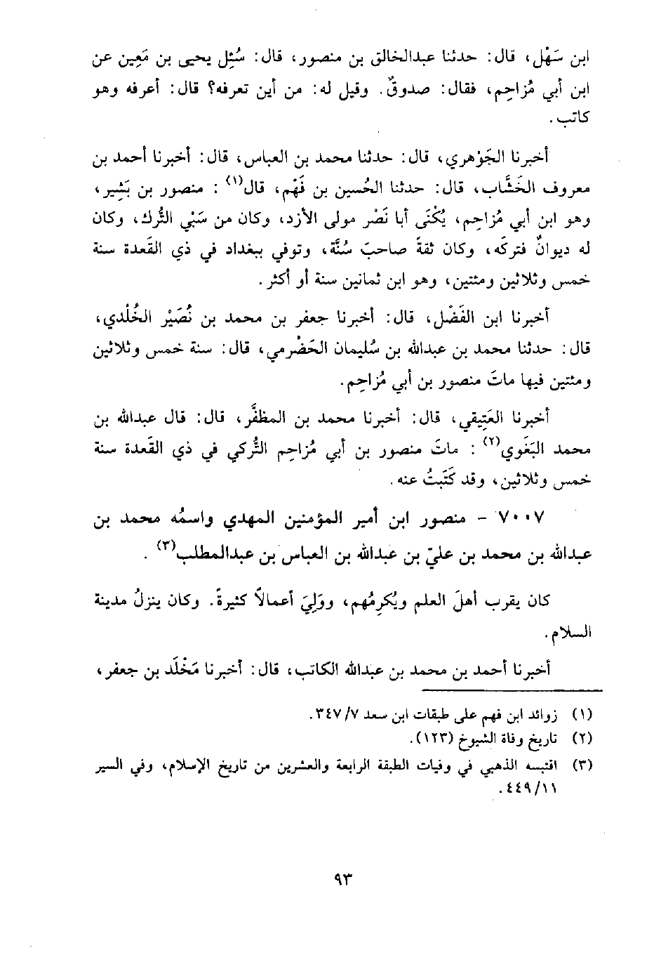 7007 - منصور بن أمير المؤمنين المهدي واسمه محمد بن عبد الله بن محمد بن علي بن عبد الله بن العباس بن عبد المطلب كان يقرب أهل العلم ويكرمهم، وولي أعمالا كثيرة، وكان ينزل مدينة السلام.