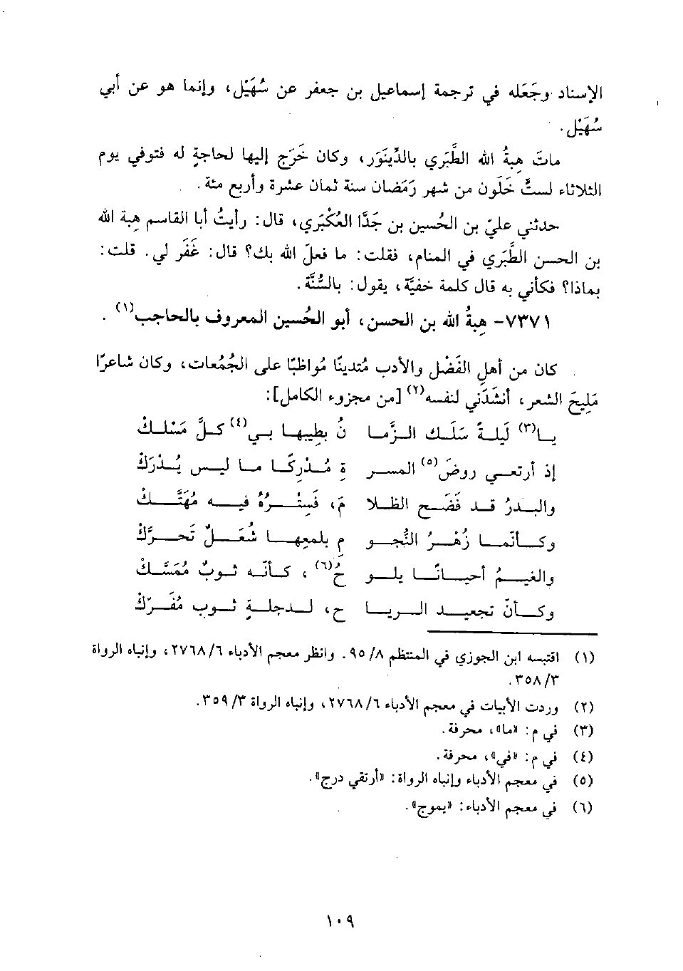 7371 - هبة الله بن الحسن أبو الحسين المعروف بالحاجب كان من أهل الفضل والأدب، متدينًا مواظبًا على الجمعات، وكان شاعرًا مليح الشعر، أنشدني لنفسه: