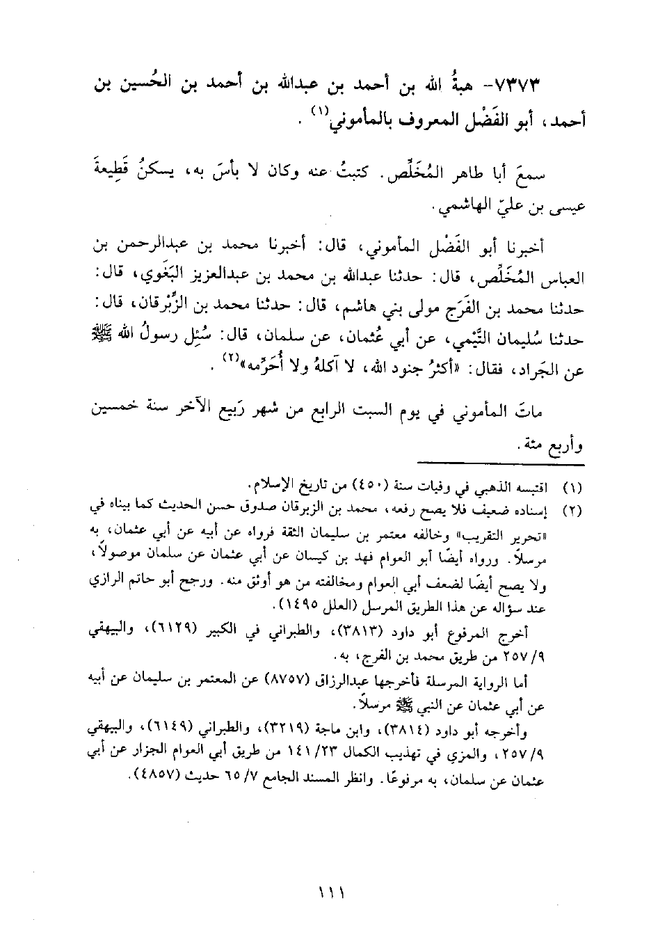 (4642) -[16: 111] أَخْبَرَنَا أَبُو الْفَضْلِ الْمَأْمُونِيُّ، قَالَ: أَخْبَرَنَا مُحَمَّدُ بْنُ عَبْدِ الرَّحْمَنِ بْنِ الْعَبَّاسِ الْمُخَلِّصُ، قَالَ: حَدَّثَنَا عَبْدُ اللَّهِ بْنُ مُحَمَّدِ بْنِ عَبْدِ الْعَزِيزِ الْبَغَوِيُّ، قَالَ: حَدَّثَنَا مُحَمَّدُ بْنُ الْفَرَجِ، مَوْلَى بَنِي هَاشِمٍ، قَالَ: حَدَّثَنَا مُحَمَّدُ بْنُ الزِّبْرِقَانِ، قَالَ: حَدَّثَنَا سُلَيْمَانُ التَّيْمِيُّ، عَنْ أَبِي عُثْمَانَ، عَنْ سَلْمَانَ، قَالَ: سُئِلَ رَسُولُ اللَّهِ، صَلَّى اللَّهُ عَلَيْهِ وَسَلَّمَ عَنِ الْجَرَادِ، فَقَالَ: " أَكْثَرُ جُنُودِ اللَّهِ، لا آكُلُهُ وَلا أُحَرِّمُهُ " مات المأموني فِي يوم السبت الرابع من شهر ربيع الآخر سنة خمسين وأربع مائة.