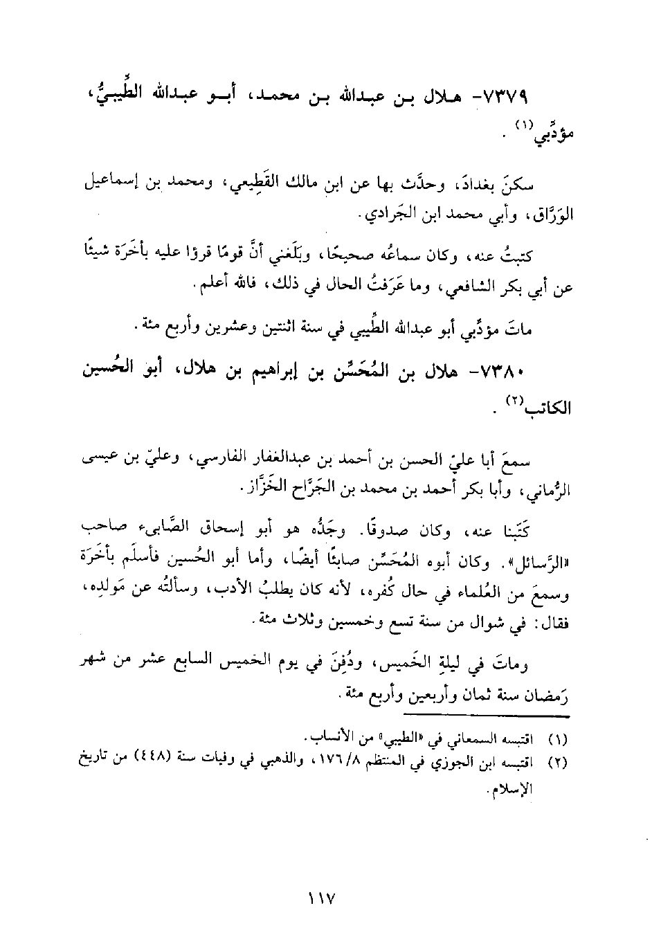 7380 - هلال بن المحسن بن إبراهيم بن هلال أبو الحسين الكاتب سَمِعَ: أَبَا علي الْحَسَن بْن أَحْمَد بْن عَبْد الغفار الفارسي، وعلي بْن عيسى الرماني، وأبا بَكْر أَحْمَد بْن مُحَمَّد بْن الجراح الخزاز.