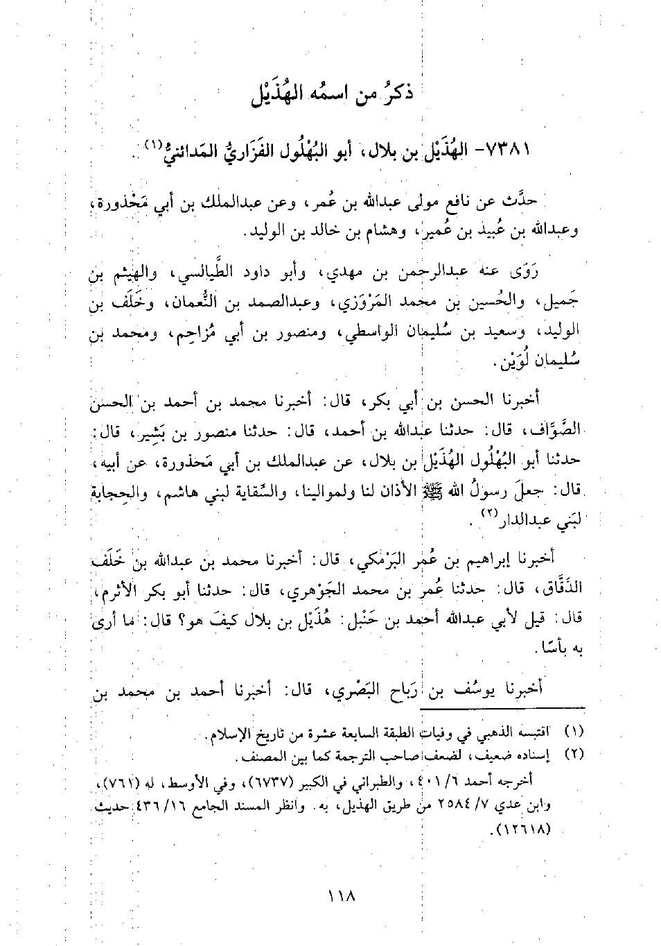 7381 - الهذيل بْن بلال أَبُو البهلول الفزاري المدائني حَدَّث عَن: نافع مولى عَبْد الله بْن عُمَر، وعن عَبْد الملك بْن أبي محذورة، وعبد الله بْن عُبَيْد بْن عمير، وهشام بْن خَالِد بْن الوليد.