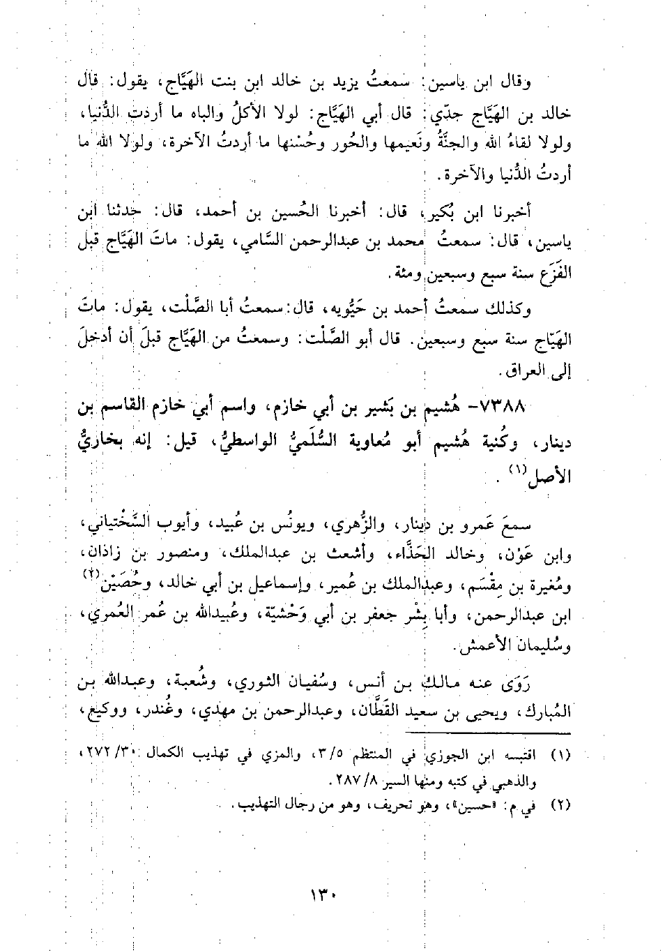 7388 - هشيم بن بشير بن أبي خازم واسم أبي خازم القاسم بن دينار وكنيته هُشيم أبو معاوية السلمي الواسطي قيل إنه بُخاري الأصل